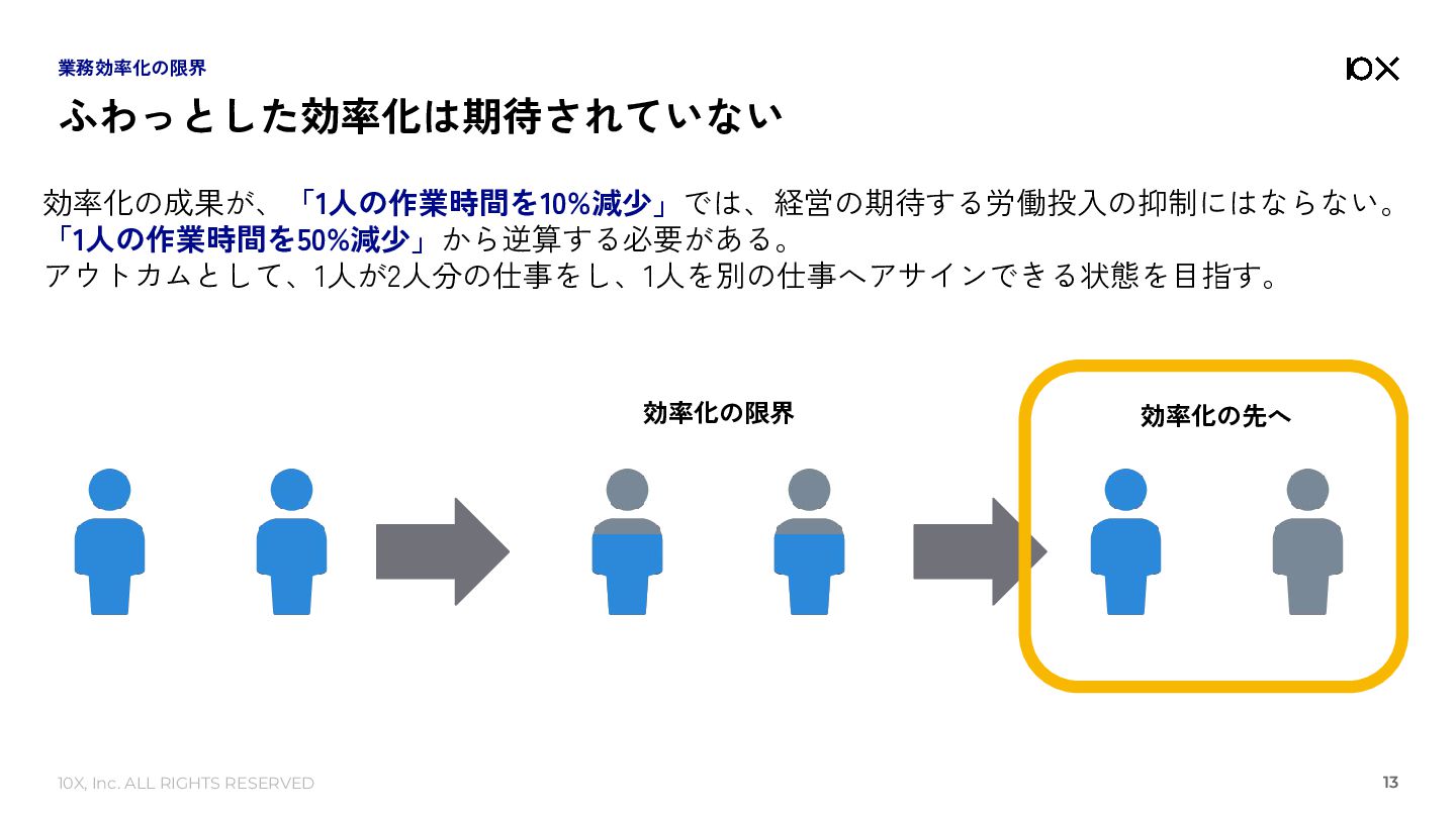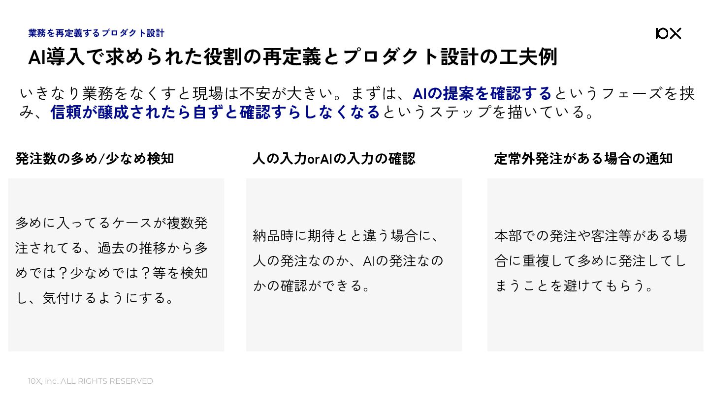 12. 10X, Inc. ALL RIGHTS RESERVED 本部での発注や客注等がある場 合に重複して多めに発注してし まうことを避けてもらう。 AI導入で求められた役割の再定義とプロダクト設計の工夫例 業務を再定義するプロダクト設計