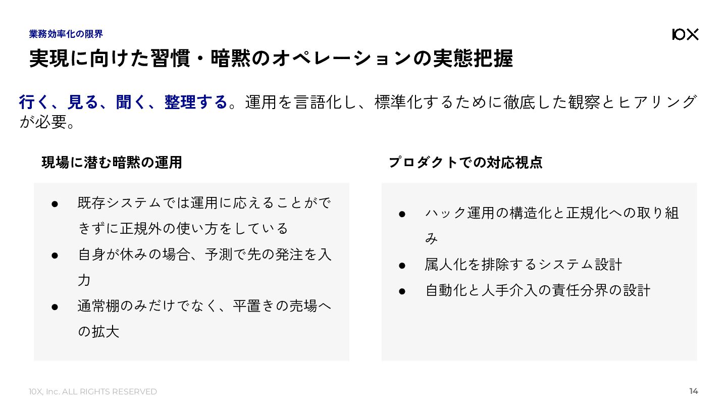 きずに正規外の使い方をしている • 自身が休みの場合、予測で先の発注を入 力 • 通常棚のみだけでなく、平置きの売場へ の拡大 • ハック運用の構造化と正規化への取り組 み • 属人化を排除するシステム設計 • 自動化と人手介入の責任分界の設計 現場に潜む暗黙の運用 プロダクトでの対応視点 行く、見る、聞く、整理する。運用を言語化し、標準化するために徹底した観察とヒアリング が必要。