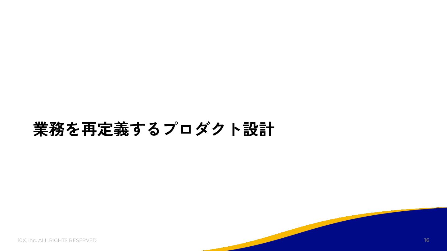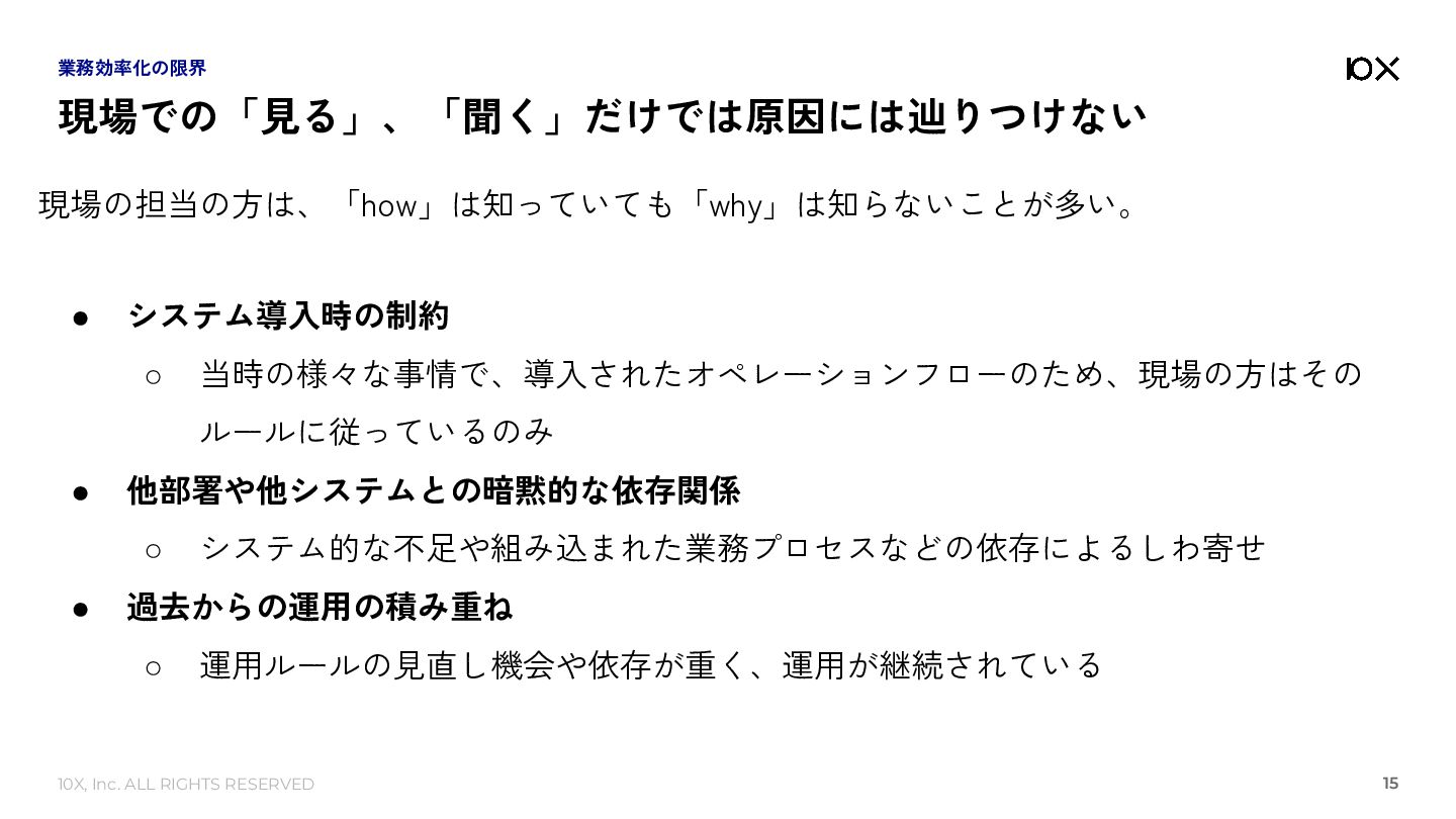 10. 10X, Inc. ALL RIGHTS RESERVED 現場での「見る」、「聞く」だけでは原因には辿りつけない 15 業務効率化の限界 現場の担当の方は、「how」は知っていても「why」は知らないことが多い。 •