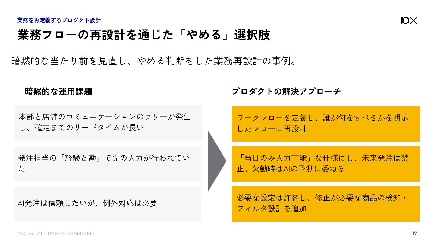 「当日のみ入力可能」な仕様にし、未来発注は禁 止。欠勤時はAIの予測に委ねる ワークフローを定義し、誰が何をすべきかを明示 したフローに再設計 発注担当の「経験と勘」で先の入力が行われてい た 必要な設定は許容し、修正が必要な商品の検知・ フィルタ設計を追加 AI発注は信頼したいが、例外対応は必要 暗黙的な当たり前を見直し、やめる判断をした業務再設計の事例。 暗黙的な運用課題 プロダクトの解決アプローチ