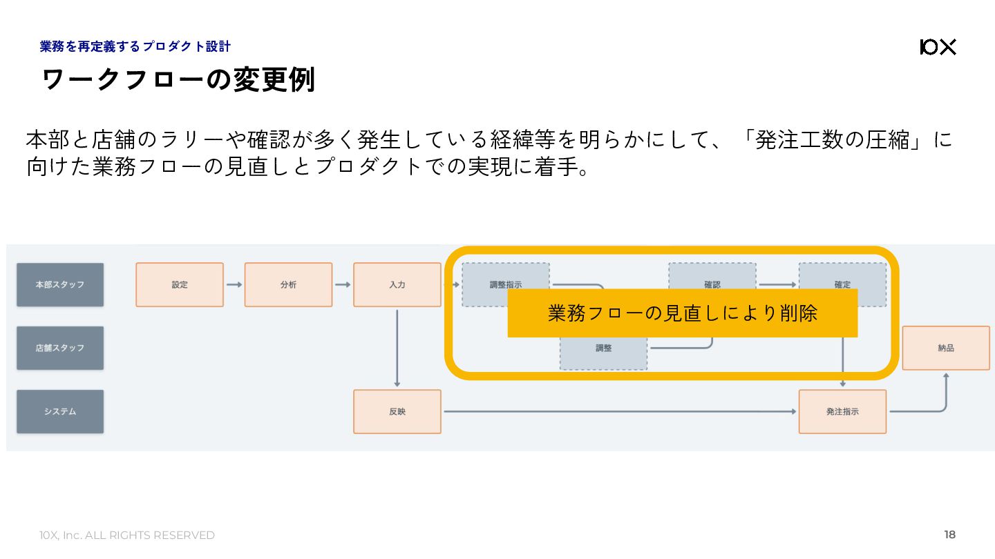 11. 10X, Inc. ALL RIGHTS RESERVED 業務フローの再設計を通じた「やめる」選択肢 17 業務を再定義するプロダクト設計 本部と店舗のコミュニケーションのラリーが発生 し、確定までのリードタイムが長い