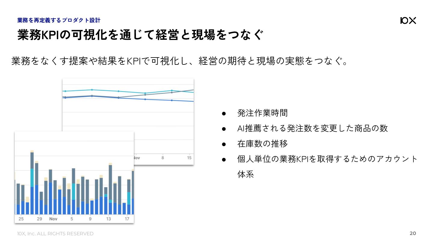 13. 10X, Inc. ALL RIGHTS RESERVED 業務KPIの可視化を通じて経営と現場をつなぐ 20 業務を再定義するプロダクト設計 • 発注作業時間