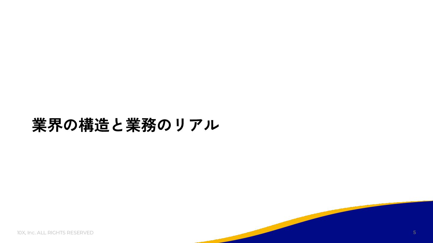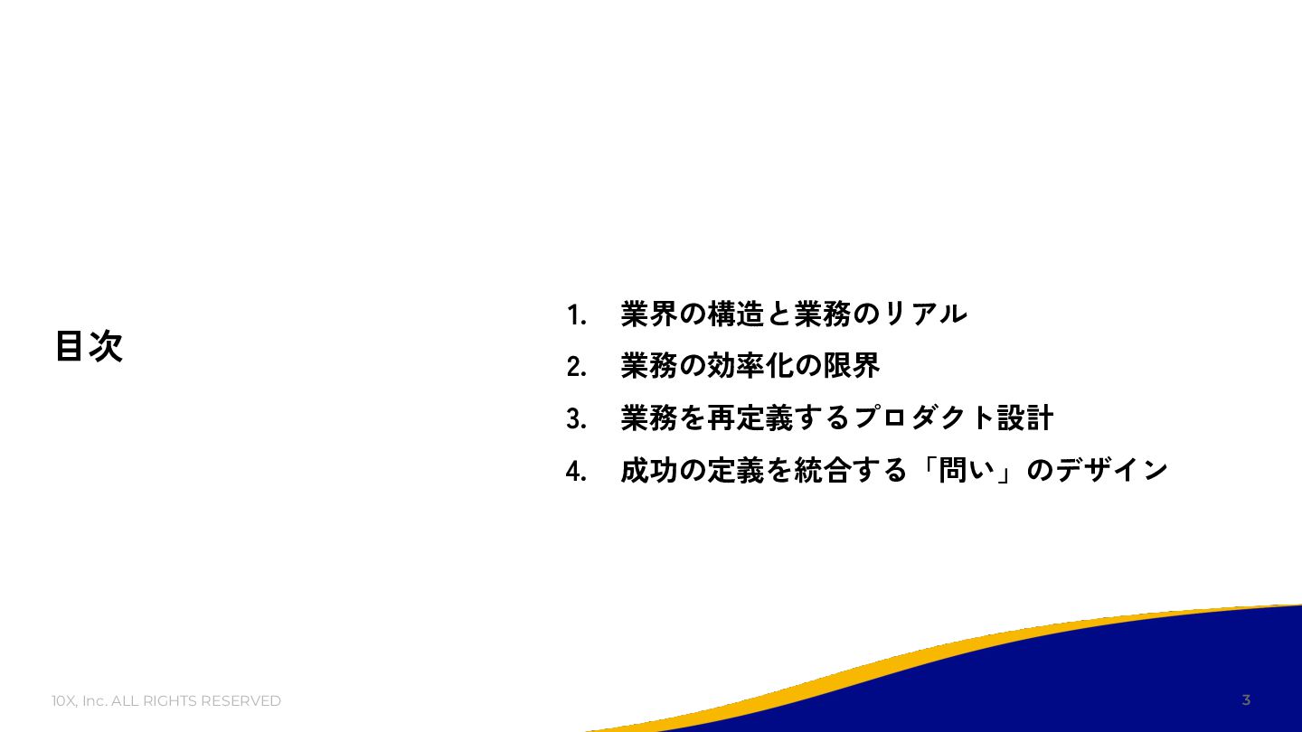 2. 10X, Inc. ALL RIGHTS RESERVED 3 目次 1. 業界の構造と業務のリアル 2.