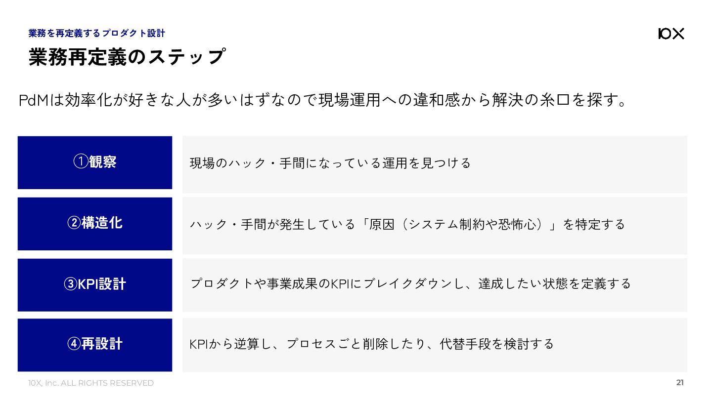 14. 10X, Inc. ALL RIGHTS RESERVED 業務再定義のステップ 21 業務を再定義するプロダクト設計 PdMは効率化が好きな人が多いはずなので現場運用への違和感から解決の糸口を探す。 現場のハック・手間になっている運用を見つける