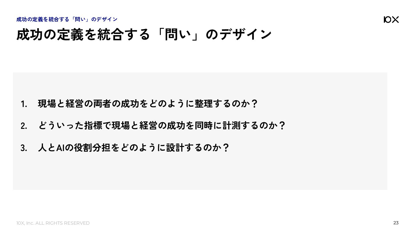 どういった指標で現場と経営の成功を同時に計測するのか? 3. 人とAIの役割分担をどのように設計するのか? 成功の定義を統合する「問い」のデザイン