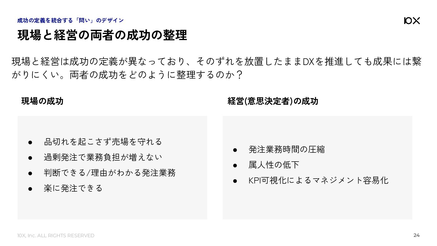 15. 10X, Inc. ALL RIGHTS RESERVED 成功の定義を統合する「問い」のデザイン 23 1. 現場と経営の両者の成功をどのように整理するのか? 2.
