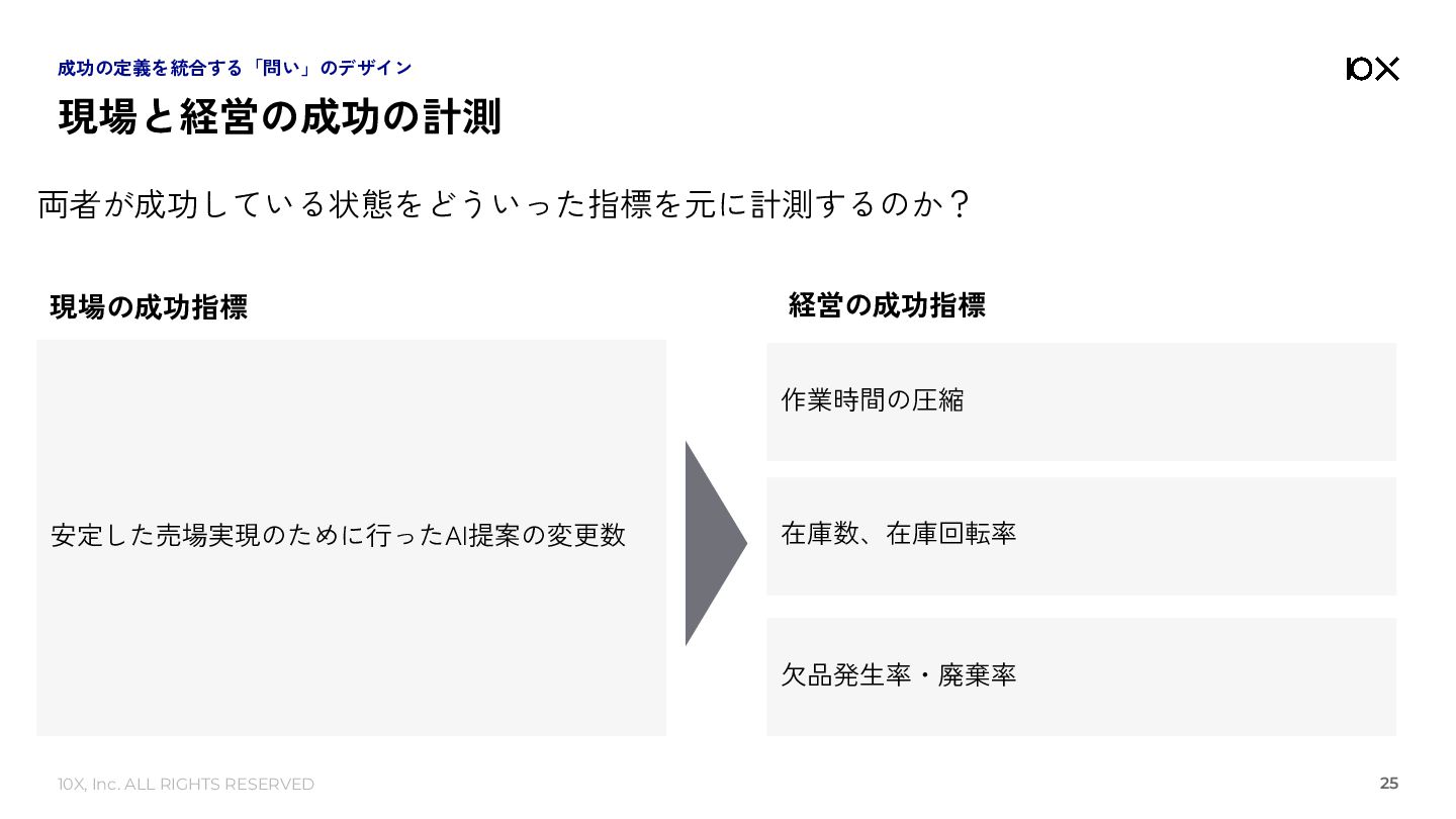16. 10X, Inc. ALL RIGHTS RESERVED 現場と経営の両者の成功の整理 24 成功の定義を統合する「問い」のデザイン 現場と経営は成功の定義が異なっており、そのずれを放置したままDXを推進しても成果には繋 がりにくい。両者の成功をどのように整理するのか?