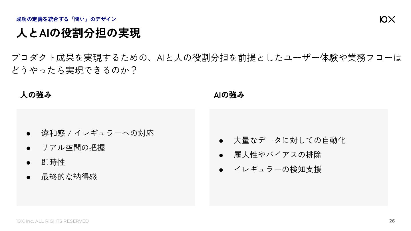 18. 10X, Inc. ALL RIGHTS RESERVED 人とAIの役割分担の実現 26 成功の定義を統合する「問い」のデザイン プロダクト成果を実現するための、AIと人の役割分担を前提としたユーザー体験や業務フローは どうやったら実現できるのか?