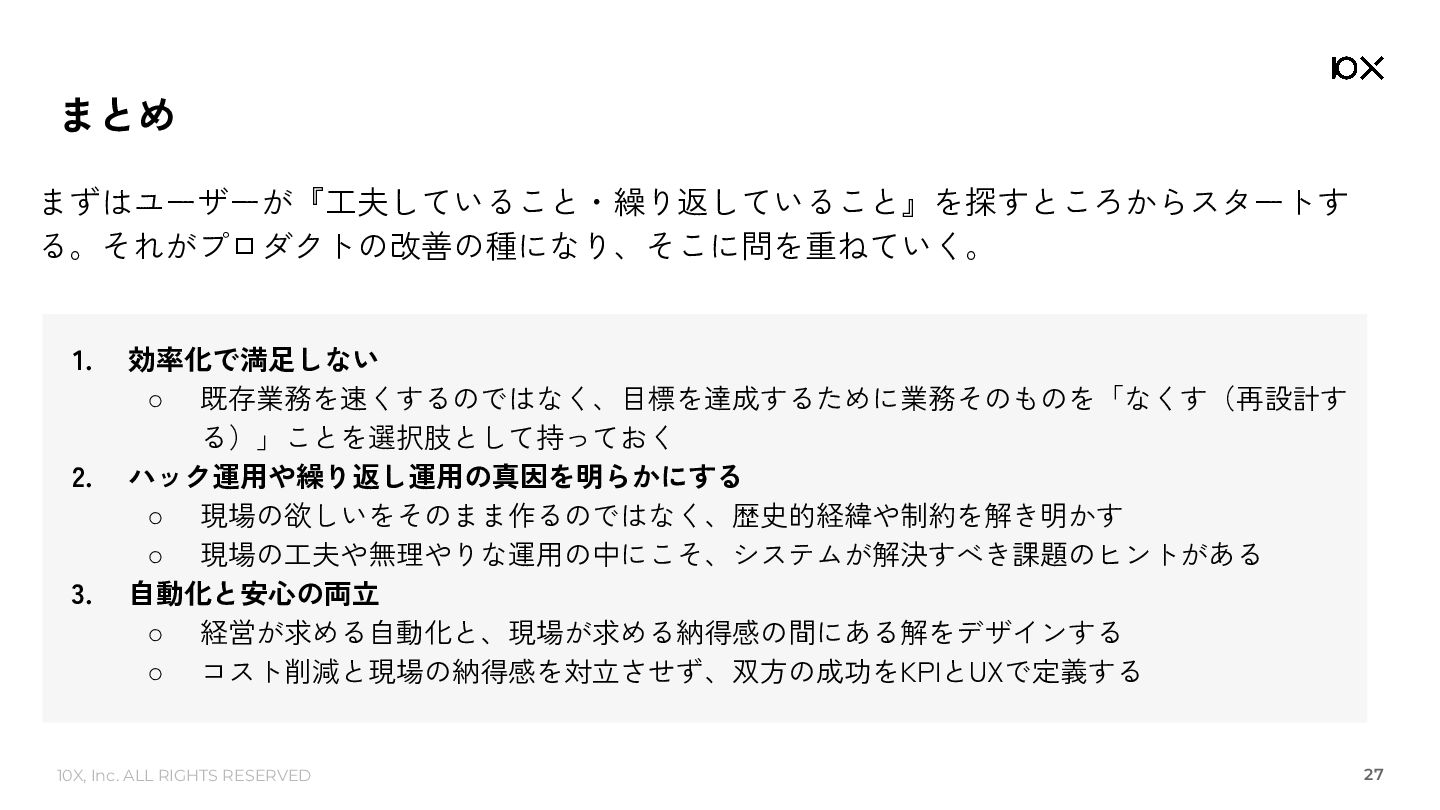 既存業務を速くするのではなく、目標を達成するために業務そのものを「なくす(再設計す る)」ことを選択肢として持っておく 2. ハック運用や繰り返し運用の真因を明らかにする ◦ 現場の欲しいをそのまま作るのではなく、歴史的経緯や制約を解き明かす ◦ 現場の工夫や無理やりな運用の中にこそ、システムが解決すべき課題のヒントがある 3. 自動化と安心の両立 ◦ 経営が求める自動化と、現場が求める納得感の間にある解をデザインする ◦ コスト削減と現場の納得感を対立させず、双方の成功をKPIとUXで定義する まずはユーザーが『工夫していること・繰り返していること』を探すところからスタートす る。それがプロダクトの改善の種になり、そこに問を重ねていく。