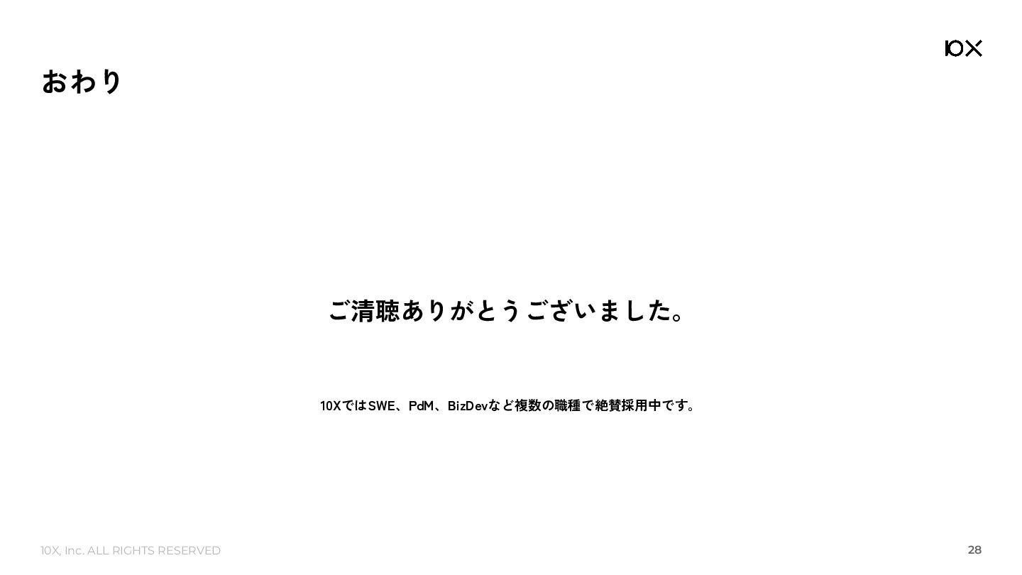 19. 10X, Inc. ALL RIGHTS RESERVED まとめ 27 1. 効率化で満足しない ◦