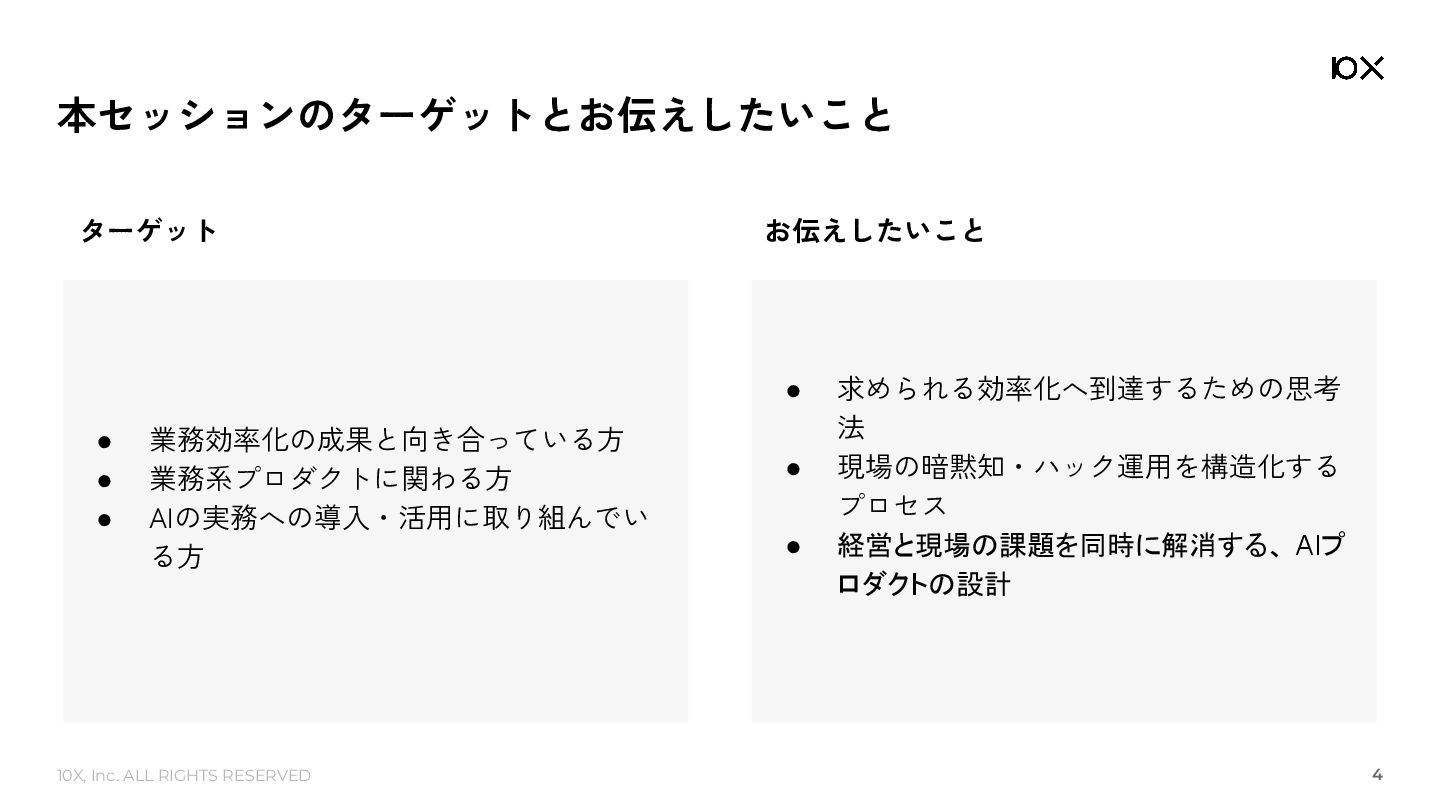 3. 10X, Inc. ALL RIGHTS RESERVED 本セッションのターゲットとお伝えしたいこと 4 • 業務効率化の成果と向き合っている方 •