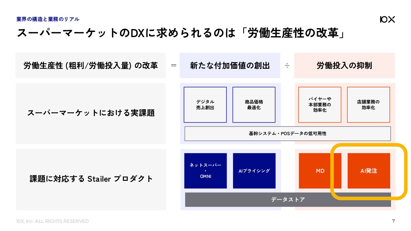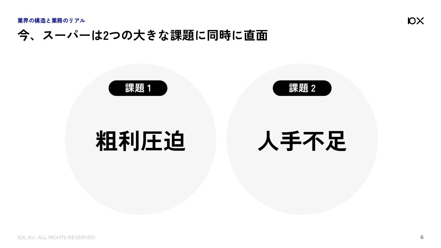 4. 10X, Inc. ALL RIGHTS RESERVED 7 業界の構造と業務のリアル スーパーマーケットのDXに求められるのは「労働生産性の改革」 労働生産性 (粗利/労働投入量)