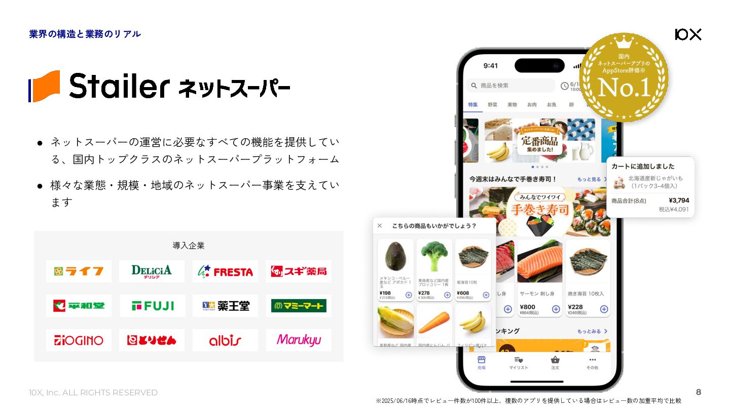 様々な業態・規模・地域のネットスーパー事業を支えてい ます 8 業界の構造と業務のリアル ※2025/06/16時点でレビュー件数が100件以上、複数のアプリを提供している場合はレビュー数の加重平均で比較 導入企業