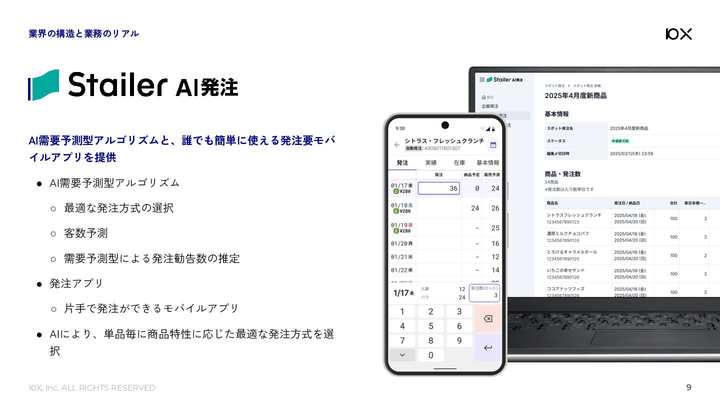 6. 10X, Inc. ALL RIGHTS RESERVED 9 AI需要予測型アルゴリズムと、誰でも簡単に使える発注要モバ イルアプリを提供 • AI需要予測型アルゴリズム