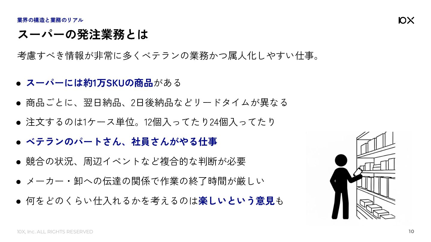 7. 10X, Inc. ALL RIGHTS RESERVED • スーパーには約1万SKUの商品がある • 商品ごとに、翌日納品、2日後納品などリードタイムが異なる •
