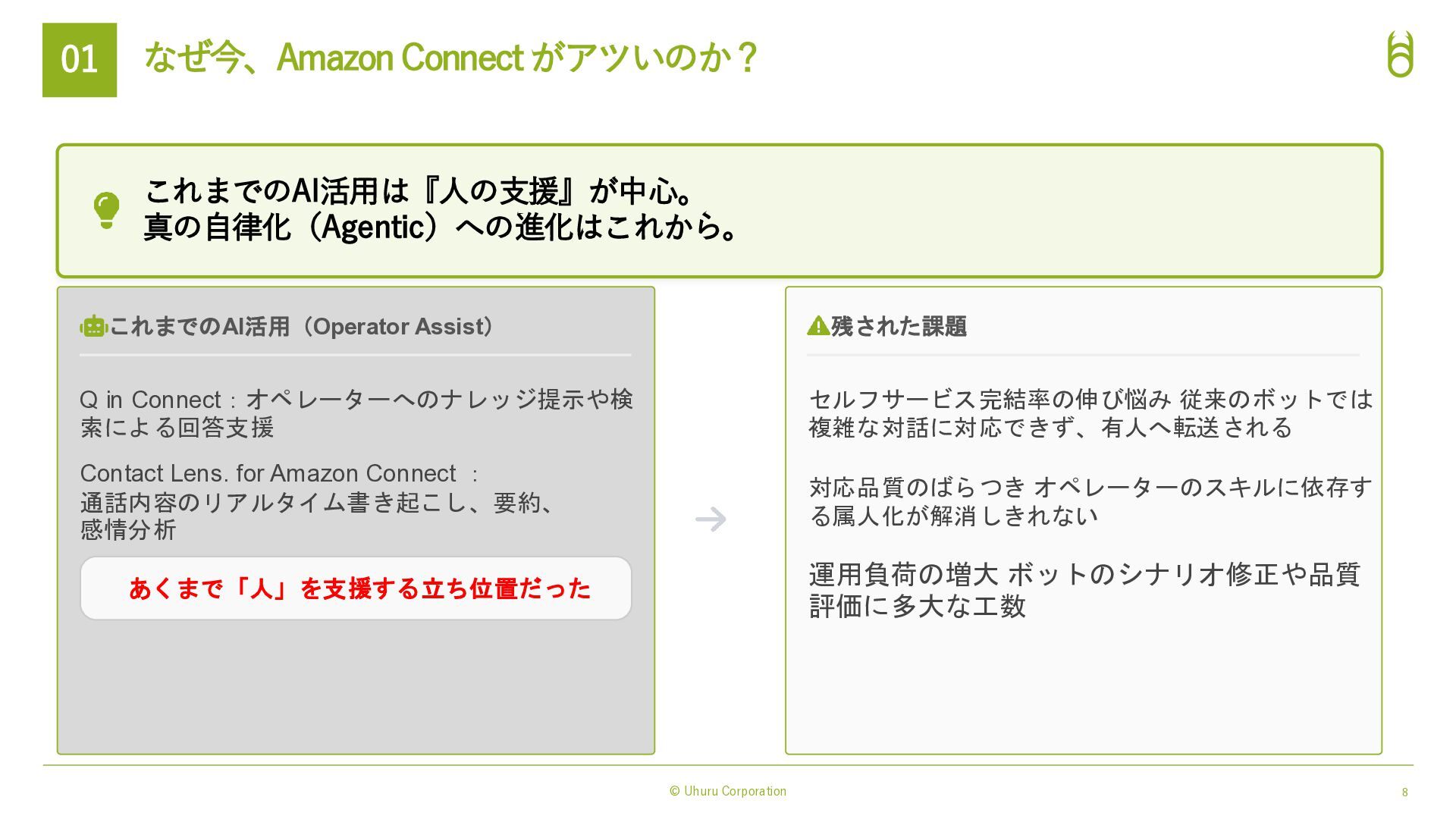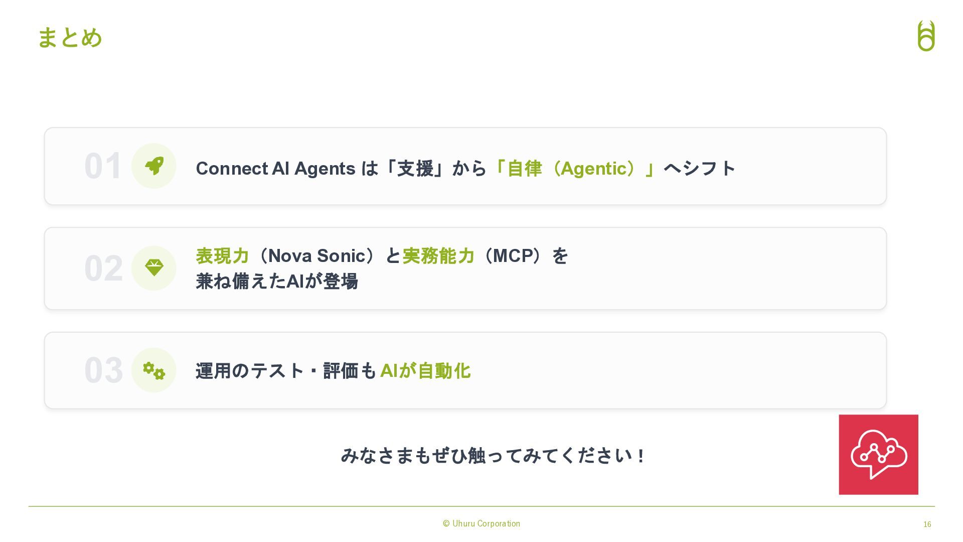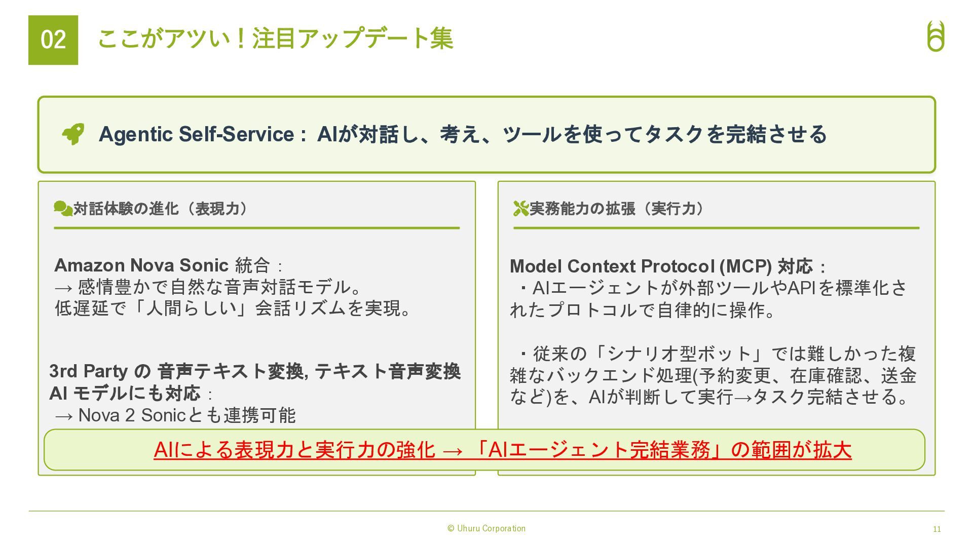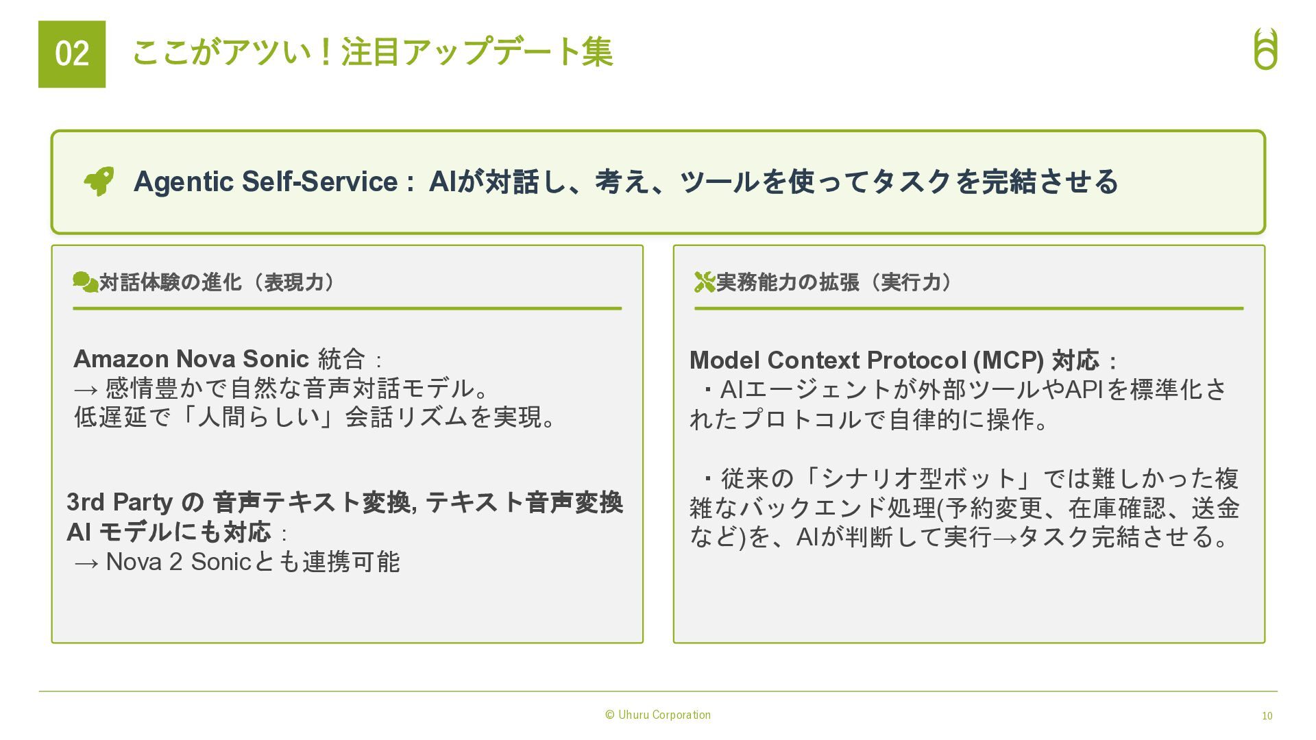 対話体験の進化(表現力) Amazon Nova Sonic 統合: → 感情豊かで自然な音声対話モデル。 低遅延で「人間らしい」会話リズムを実現。 3rd Party の 音声テキスト変換, テキスト音声変換 AI モデルにも対応: → Nova 2 Sonicとも連携可能 実務能力の拡張(実行力) Model Context Protocol (MCP) 対応: ・AIエージェントが外部ツールやAPIを標準化さ れたプロトコルで自律的に操作。 ・従来の「シナリオ型ボット」では難しかった複 雑なバックエンド処理(予約変更、在庫確認、送金 など)を、AIが判断して実行→タスク完結させる。 AIによる表現力と実行力の強化 → 「AIエージェント完結業務」の範囲が拡大