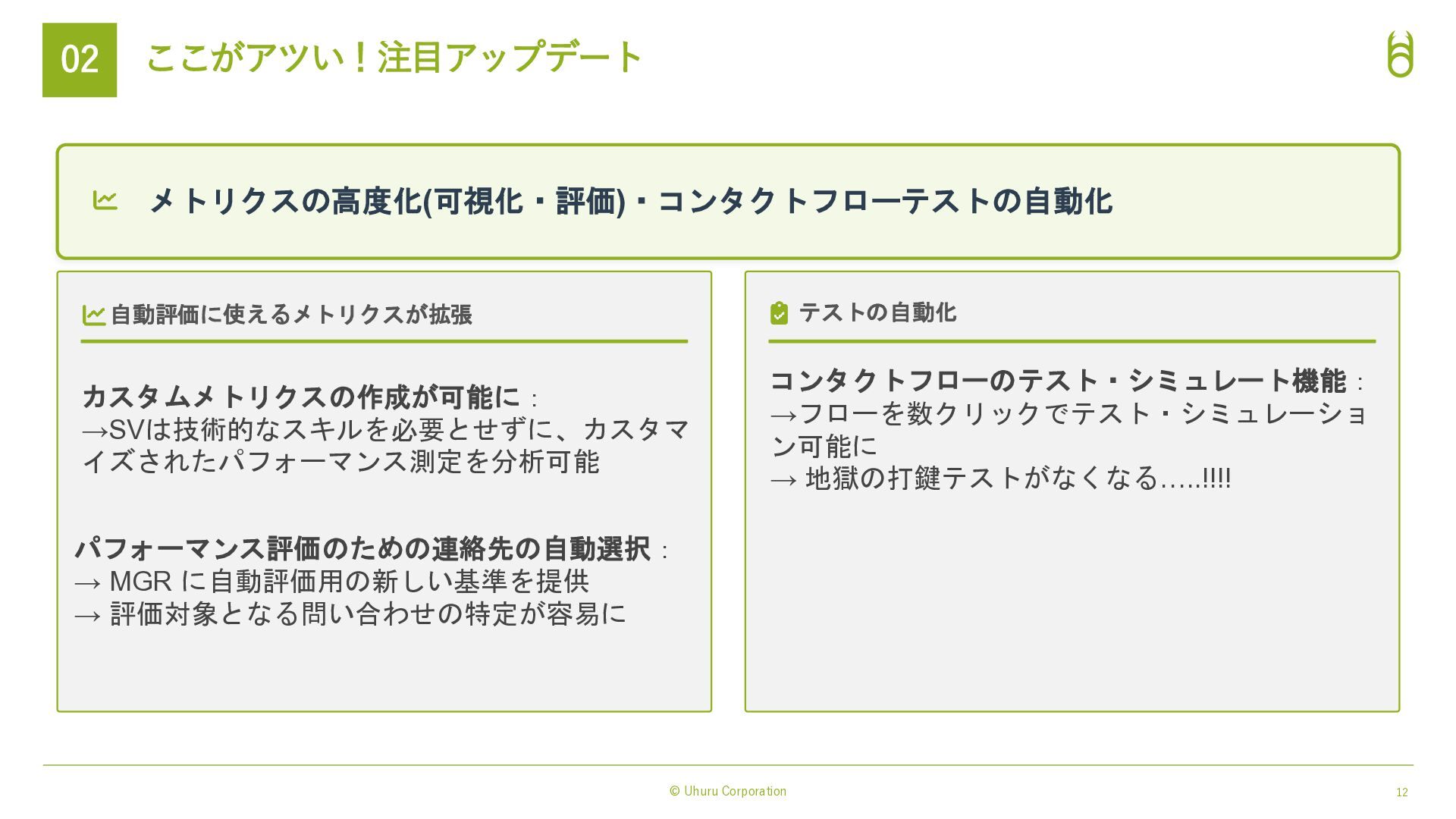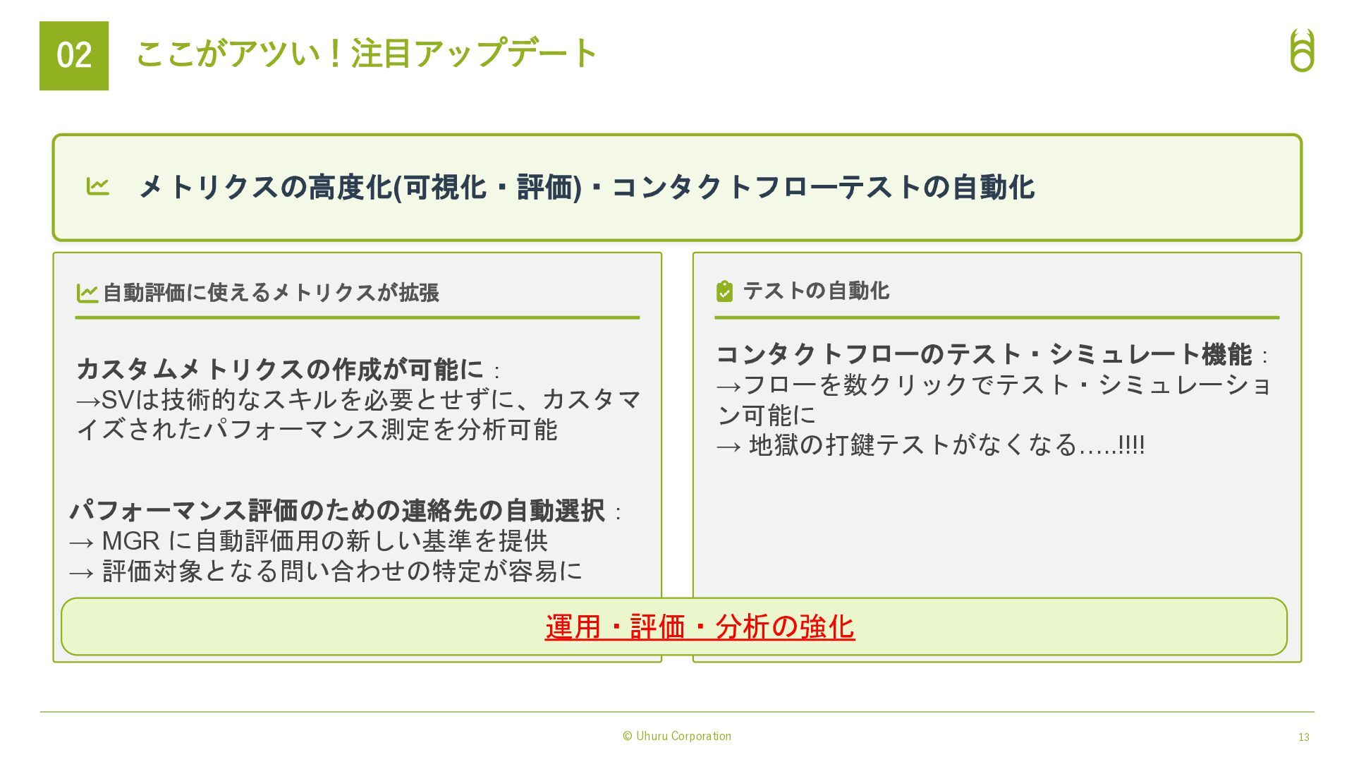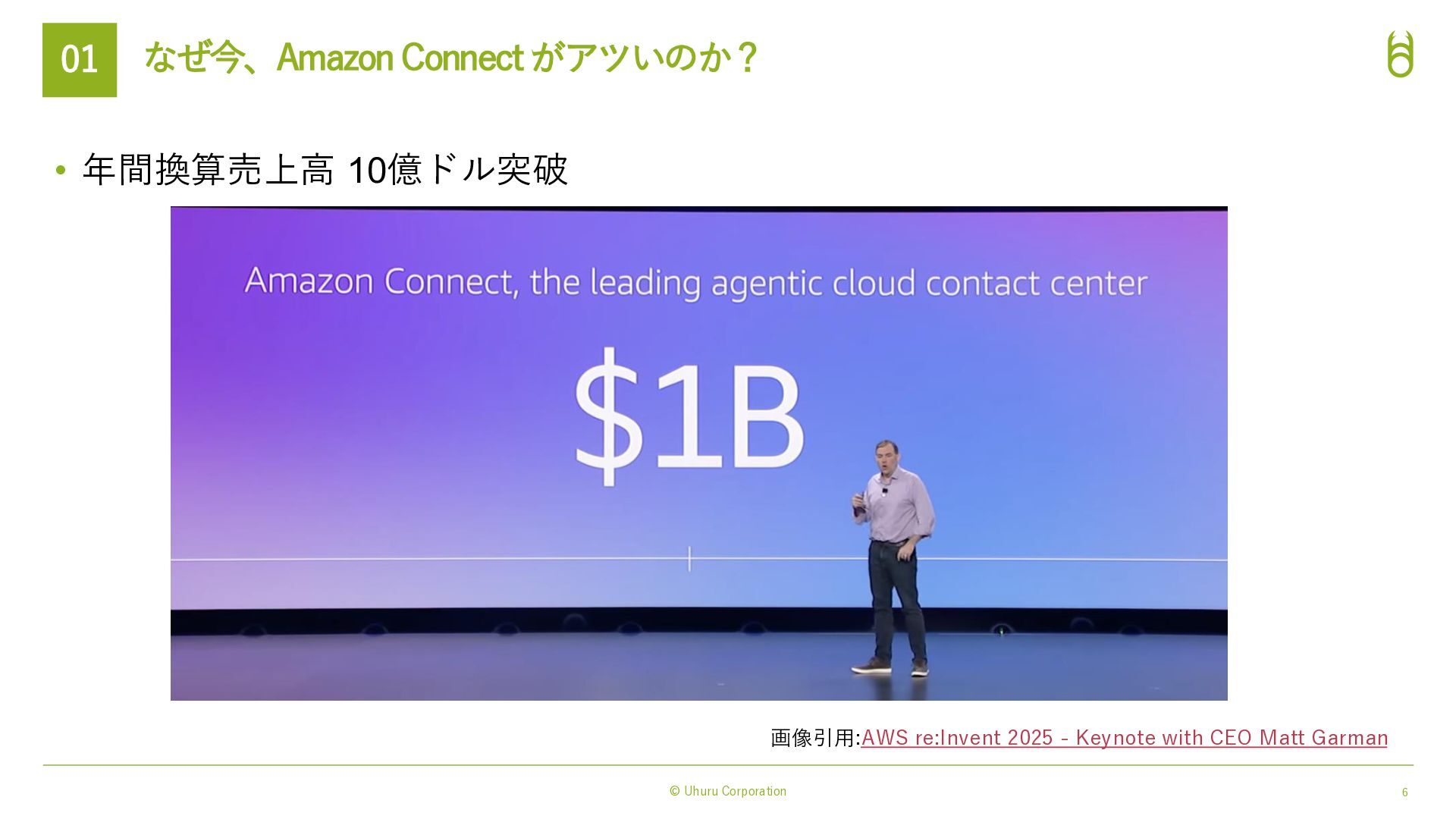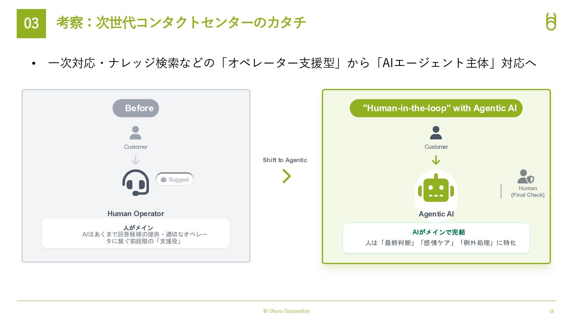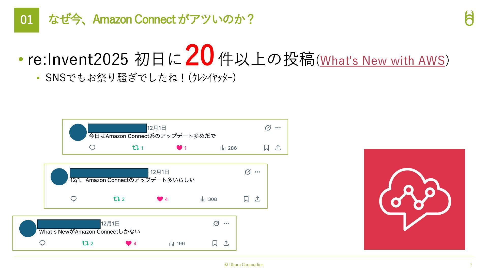 対話体験の進化(表現力) Amazon Nova Sonic 統合: → 感情豊かで自然な音声対話モデル。 低遅延で「人間らしい」会話リズムを実現。 3rd Party の 音声テキスト変換, テキスト音声変換 AI モデルにも対応: → Nova 2 Sonicとも連携可能 実務能力の拡張(実行力) Model Context Protocol (MCP) 対応: ・AIエージェントが外部ツールやAPIを標準化さ れたプロトコルで自律的に操作。 ・従来の「シナリオ型ボット」では難しかった複 雑なバックエンド処理(予約変更、在庫確認、送金 など)を、AIが判断して実行→タスク完結させる。 AIによる表現力と実行力の強化 → 「AIエージェント完結業務」の範囲が拡大