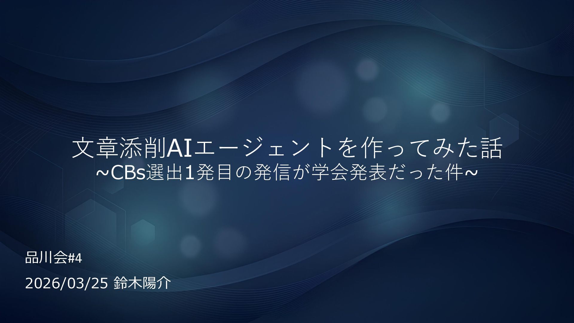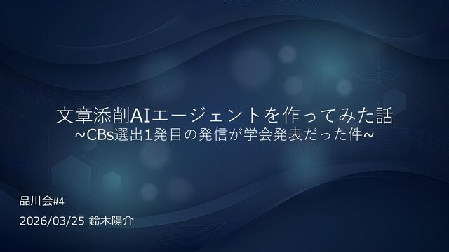 文章添削AIエージェントを作ってみた話 ~CBs選出1発目の発信が学会発表だった件~ 品川会#4 2026/03/25 鈴木陽介