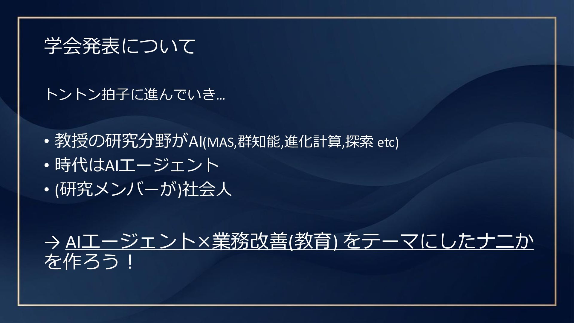 学会発表について トントン拍子に進んでいき… • 教授の研究分野がAI(MAS,群知能,進化計算,探索 etc) • 時代はAIエージェント • (研究メンバーが)社会人 →