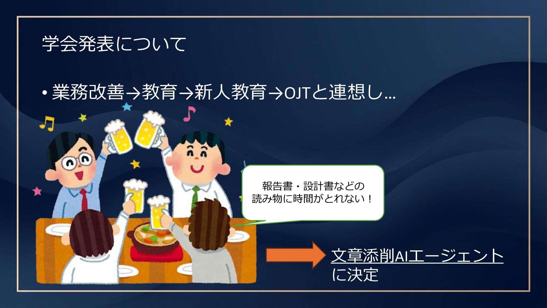 学会発表について • 業務改善→教育→新人教育→OJTと連想し… 報告書・設計書などの 読み物に時間がとれない! 文章添削AIエージェント に決定