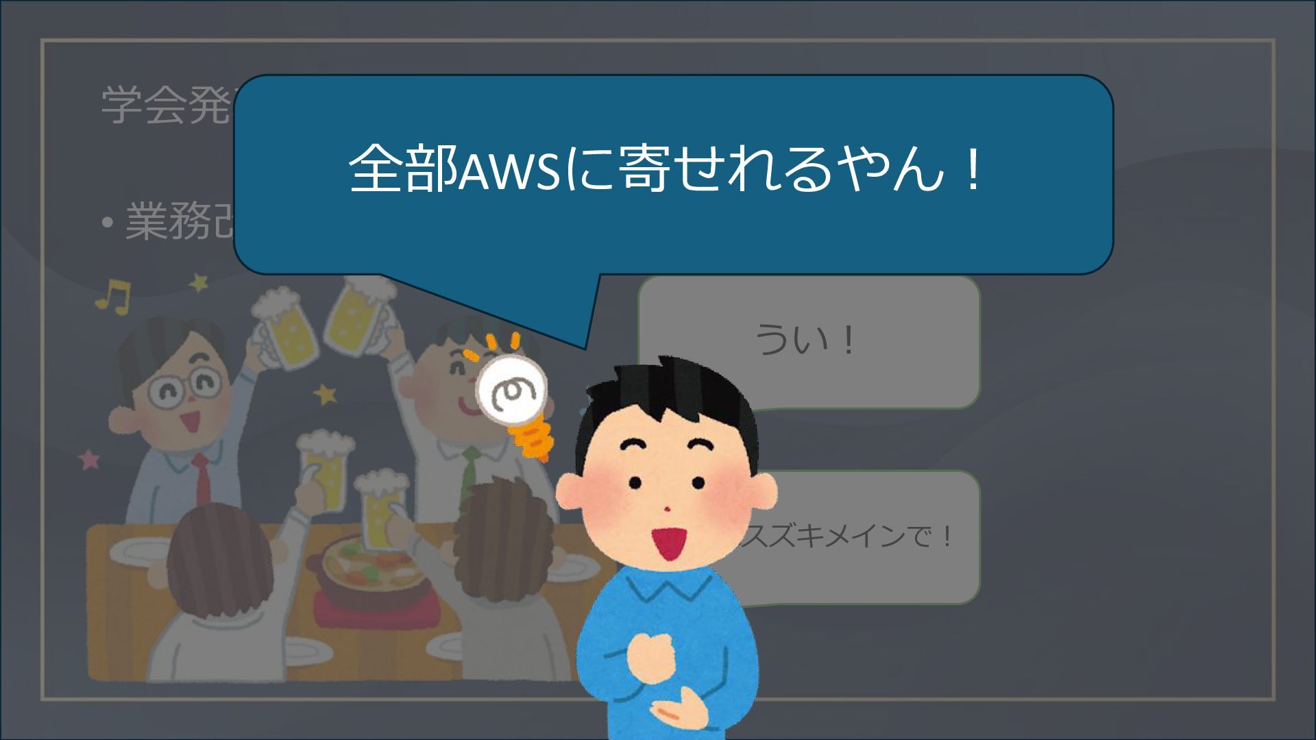 学会発表について • 業務改善→教育→新人教育→OJTと連想し… 開発はスズキメインで! うい! 全部AWSに寄せれるやん!