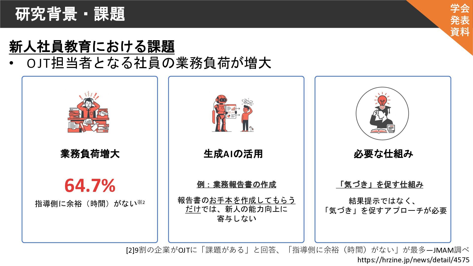 研究背景・課題 新人社員教育における課題 • OJT担当者となる社員の業務負荷が増大 業務負荷増大 64.7% 指導側に余裕(時間)がない※2 生成AIの活用 報告書のお手本を作成してもらう だけでは、新人の能力向上に