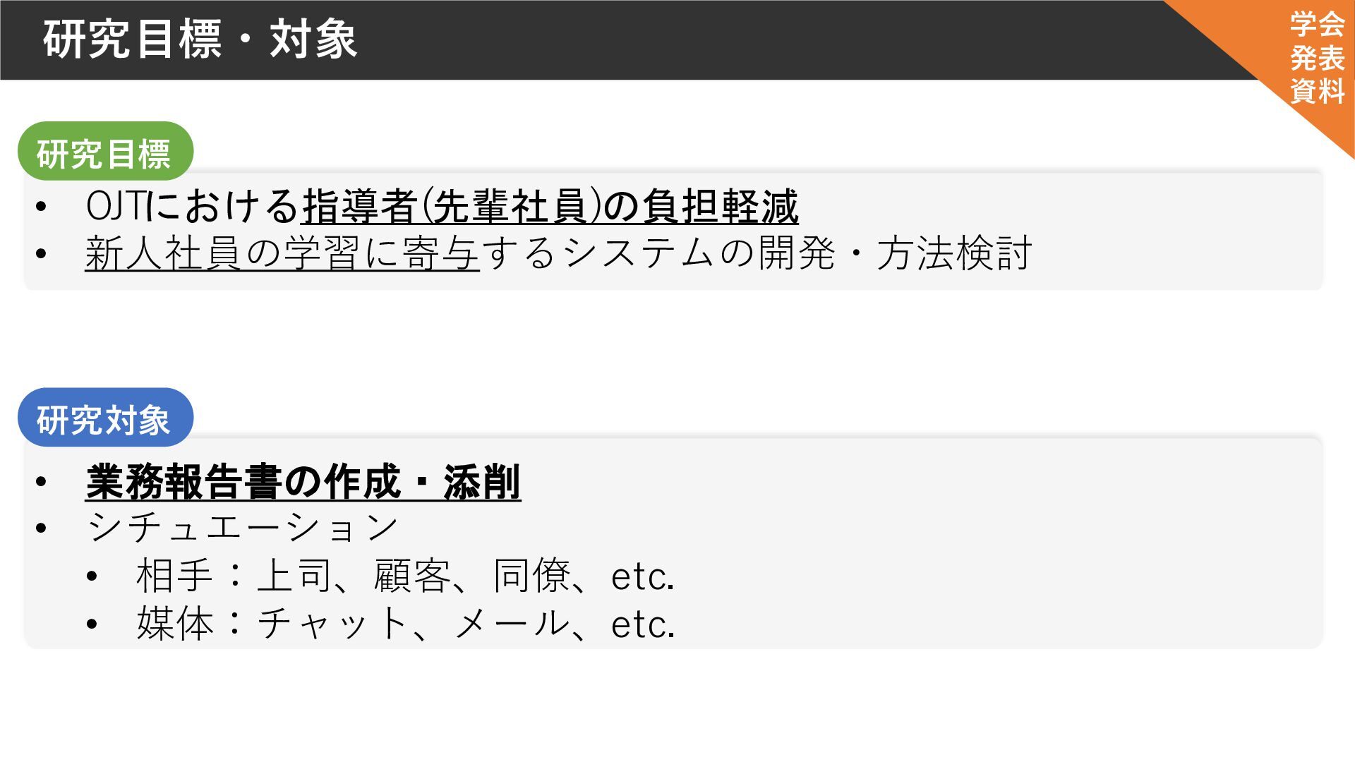 • 相手:上司、顧客、同僚、etc. • 媒体:チャット、メール、etc. 研究対象 学会 発表 資料