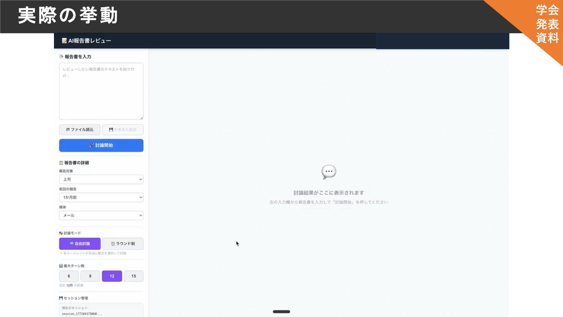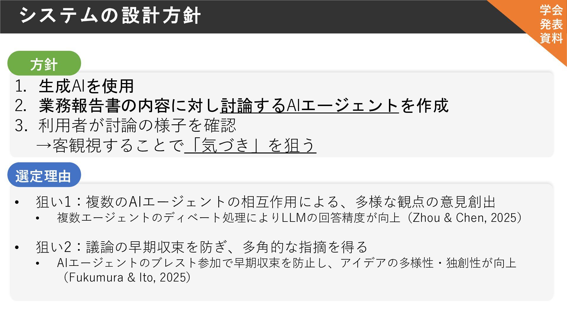 狙い1:複数のAIエージェントの相互作用による、多様な観点の意見創出 • 複数エージェントのディベート処理によりLLMの回答精度が向上(Zhou & Chen, 2025) • 狙い2:議論の早期収束を防ぎ、多角的な指摘を得る • AIエージェントのブレスト参加で早期収束を防止し、アイデアの多様性・独創性が向上 (Fukumura & Ito, 2025) 選定理由 学会 発表 資料