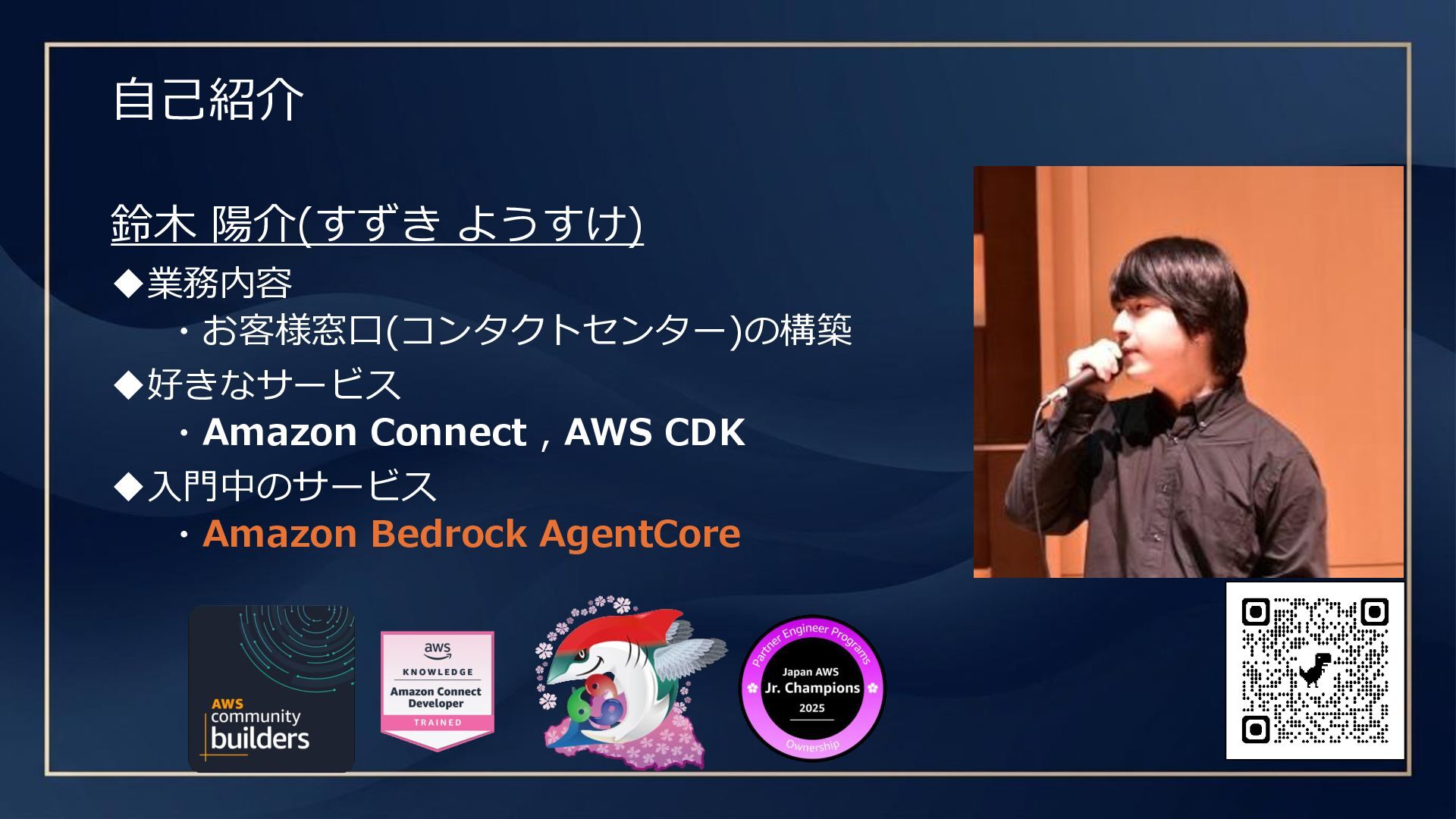 自己紹介 鈴木 陽介(すずき ようすけ) ◆業務内容 ・お客様窓口(コンタクトセンター)の構築 ◆好きなサービス ・Amazon Connect ,