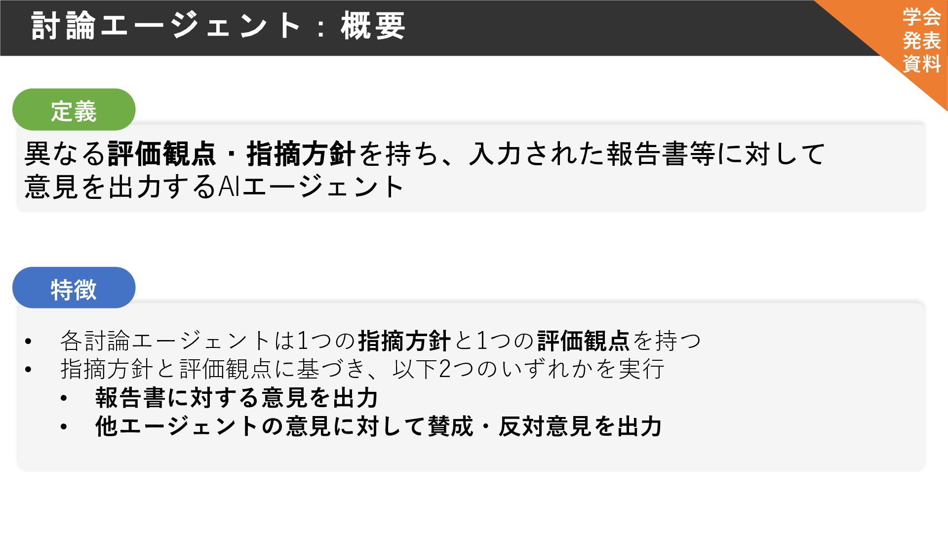 • 他エージェントの意見に対して賛成・反対意見を出力 特徴 学会 発表 資料