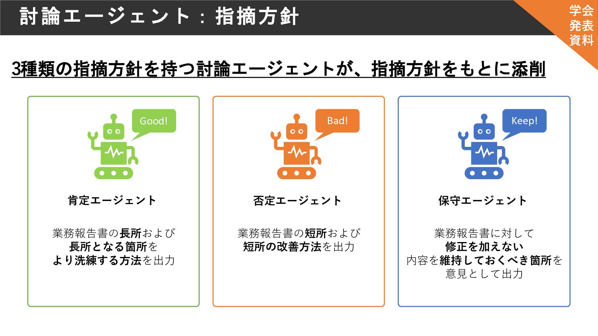 討論エージェント:指摘方針 3種類の指摘方針を持つ討論エージェントが、指摘方針をもとに添削 肯定エージェント 否定エージェント 保守エージェント Good! Bad! Keep! 業務報告書の長所および 長所となる箇所を