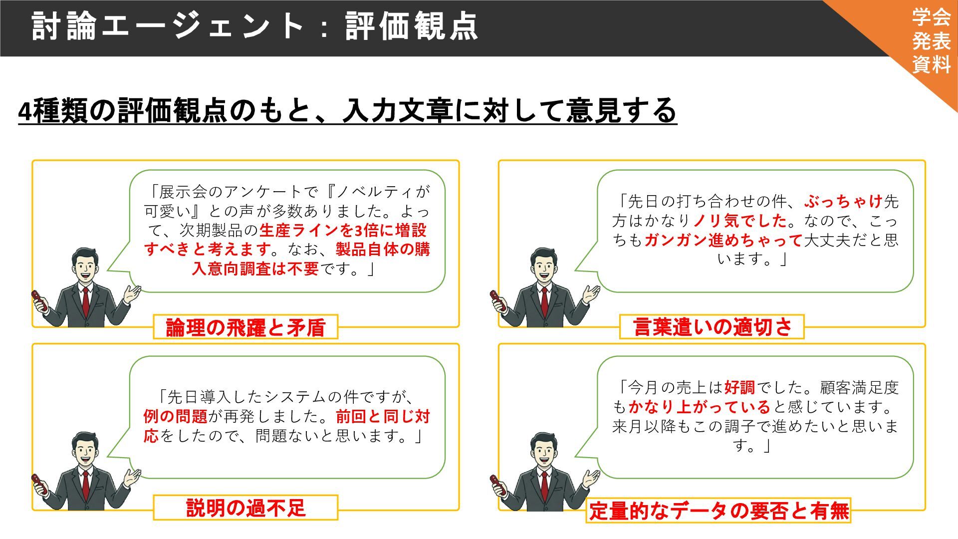 討論エージェント:評価観点 4種類の評価観点のもと、入力文章に対して意見する 論理の飛躍と矛盾 言葉遣いの適切さ 説明の過不足 「展示会のアンケートで『ノベルティが 可愛い』との声が多数ありました。よっ て、次期製品の生産ラインを3倍に増設 すべきと考えます。なお、製品自体の購 入意向調査は不要です。」