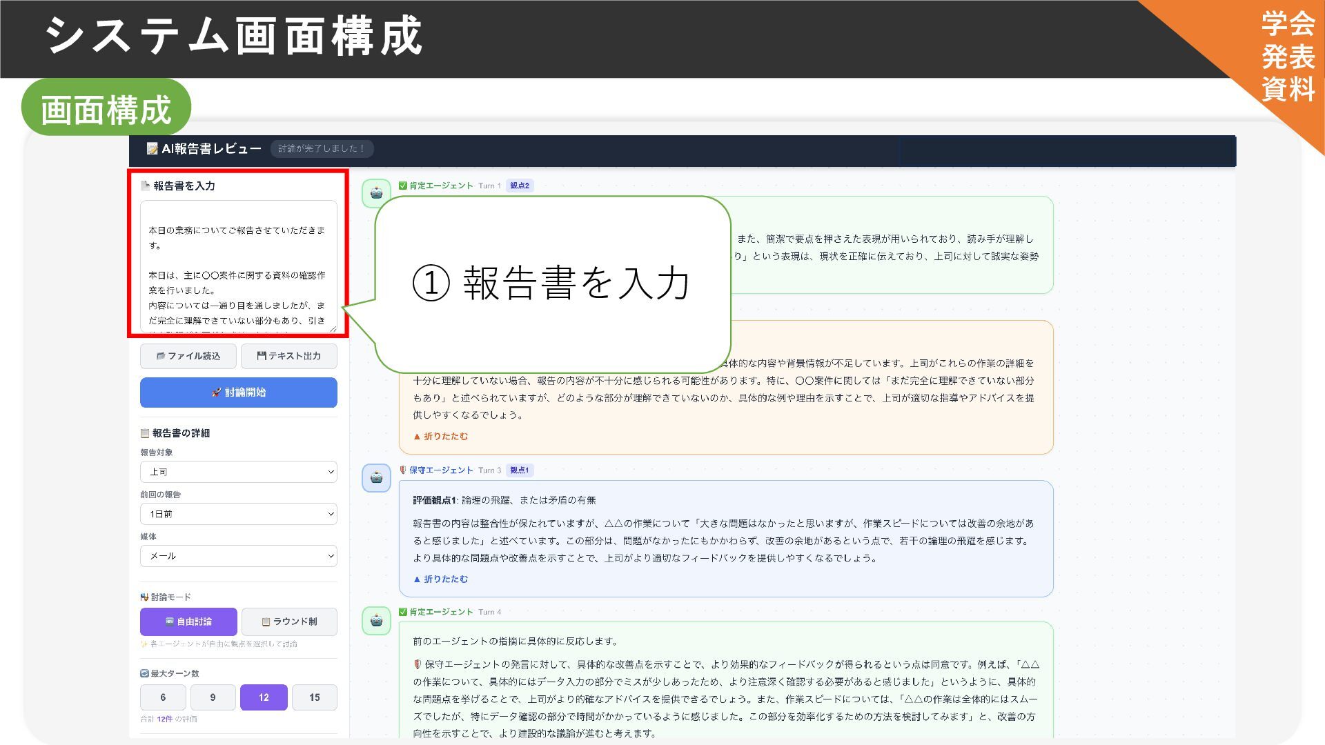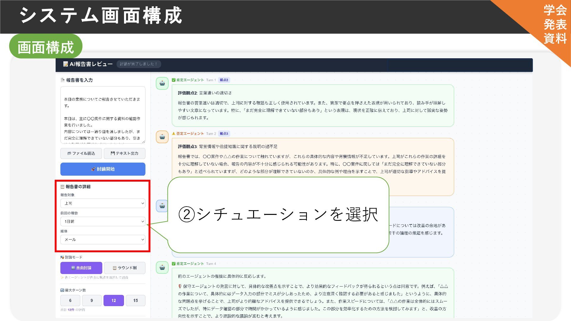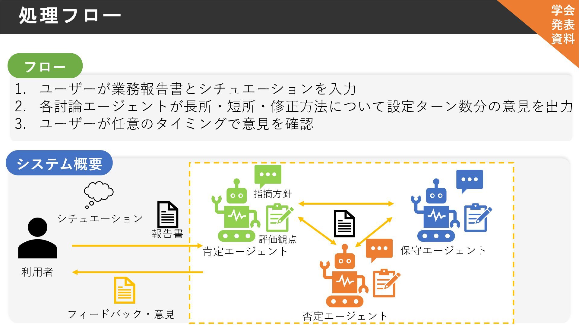 利用者 肯定エージェント シチュエーション 報告書 フィードバック・意見 システム概要 否定エージェント 保守エージェント 学会 発表 資料