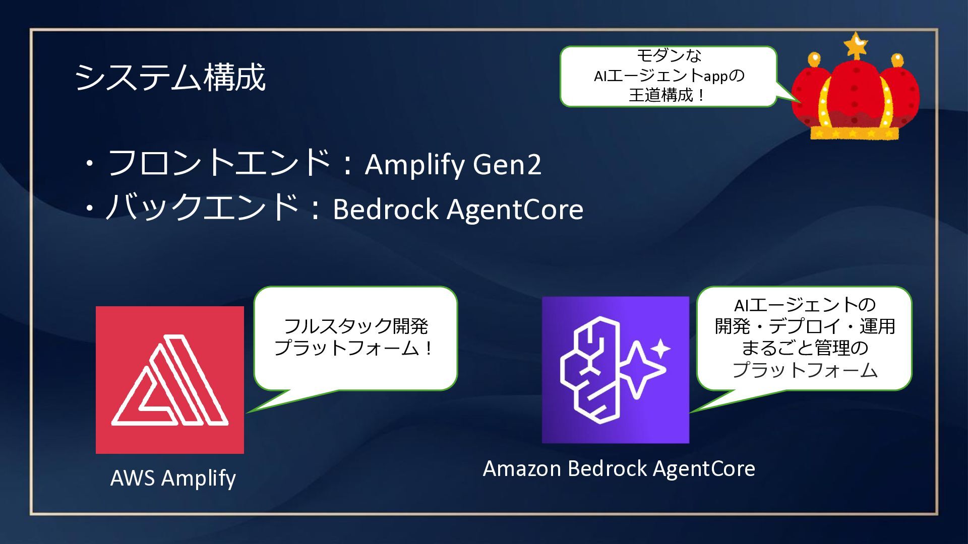 システム構成 ・フロントエンド:Amplify Gen2 ・バックエンド:Bedrock AgentCore AWS Amplify Amazon Bedrock AgentCore