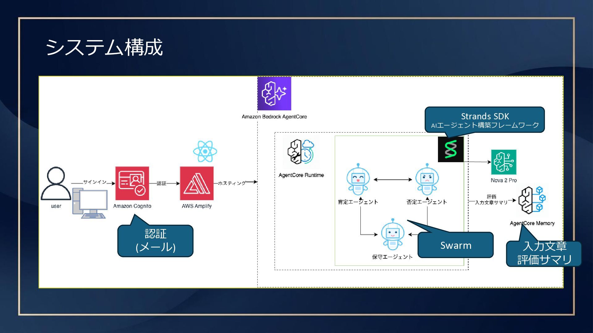 システム構成 認証 (メール) Swarm 入力文章 評価サマリ Strands SDK AIエージェント構築フレームワーク
