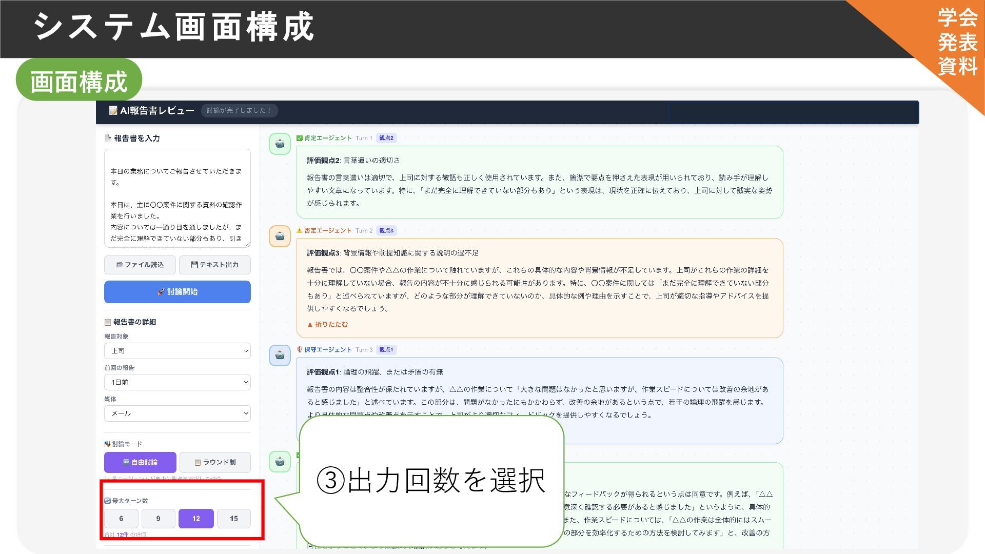 システム画面構成 画面構成 ③出力回数を選択 学会 発表 資料