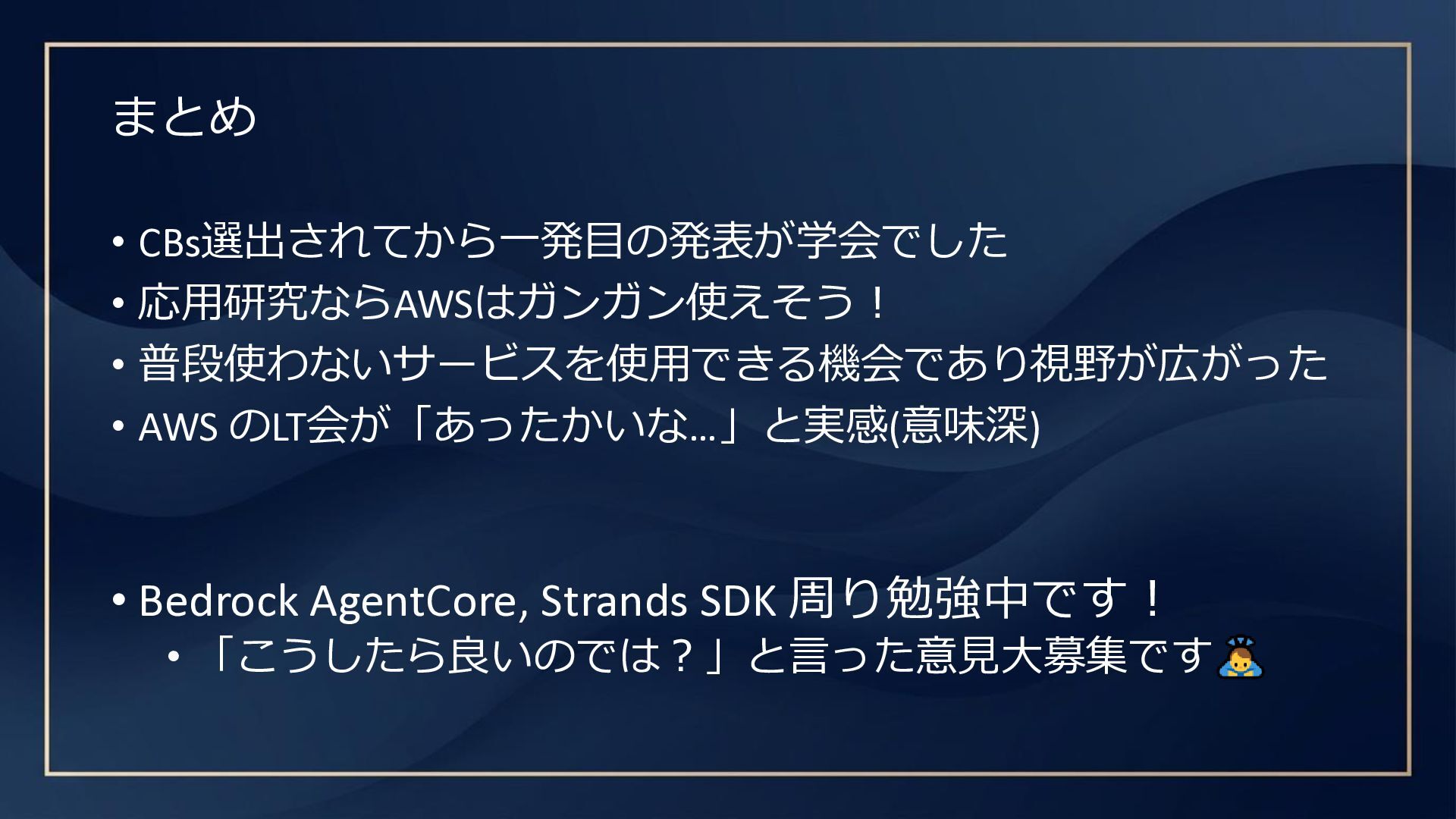 まとめ • CBs選出されてから一発目の発表が学会でした • 応用研究ならAWSはガンガン使えそう! • 普段使わないサービスを使用できる機会であり視野が広がった • AWS のLT会が「あったかいな…」と実感(意味深)