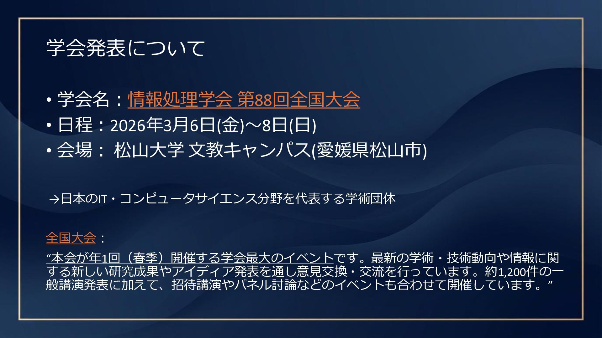 学会発表について • 学会名:情報処理学会 第88回全国大会 • 日程:2026年3月6日(金)〜8日(日) • 会場: 松山大学 文教キャンパス(愛媛県松山市)