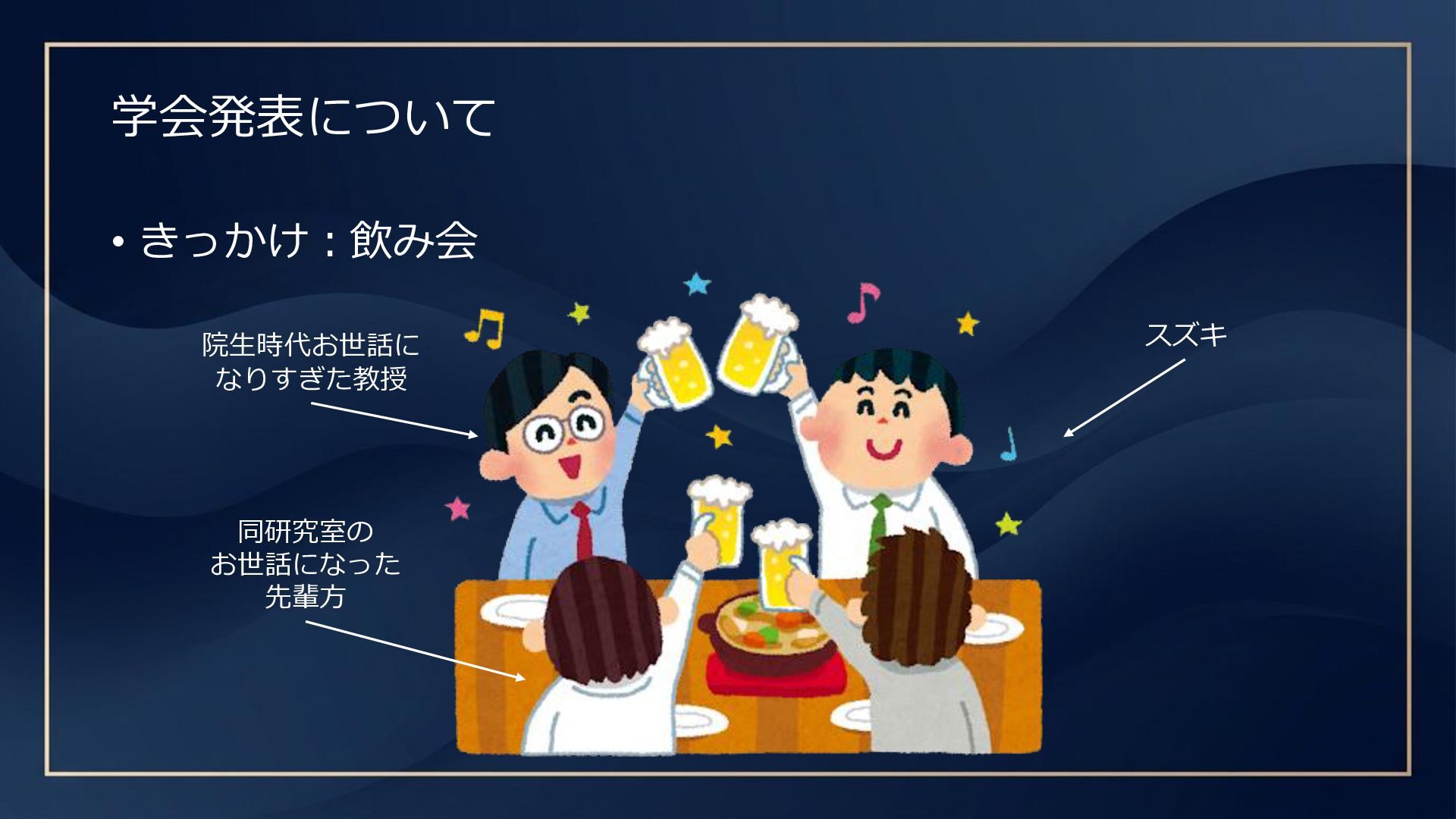 学会発表について • きっかけ:飲み会 院生時代お世話に なりすぎた教授 スズキ 同研究室の お世話になった 先輩方