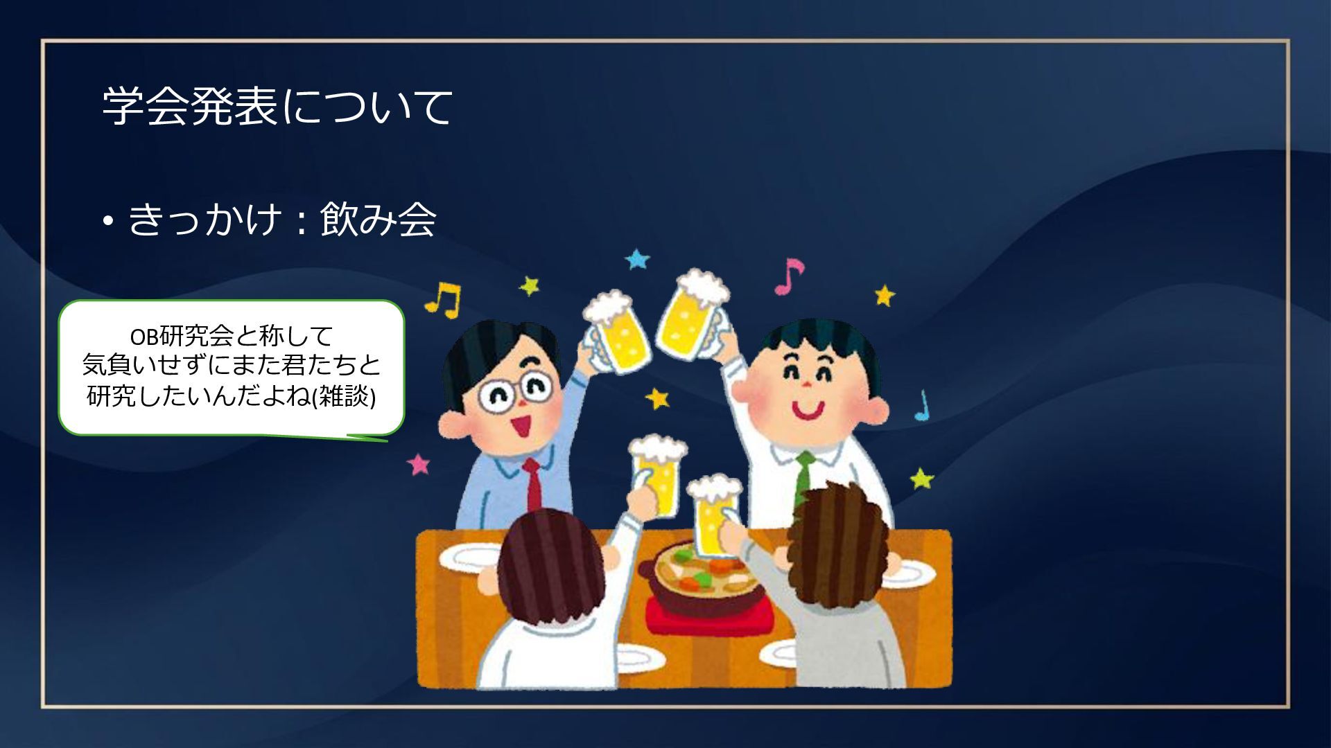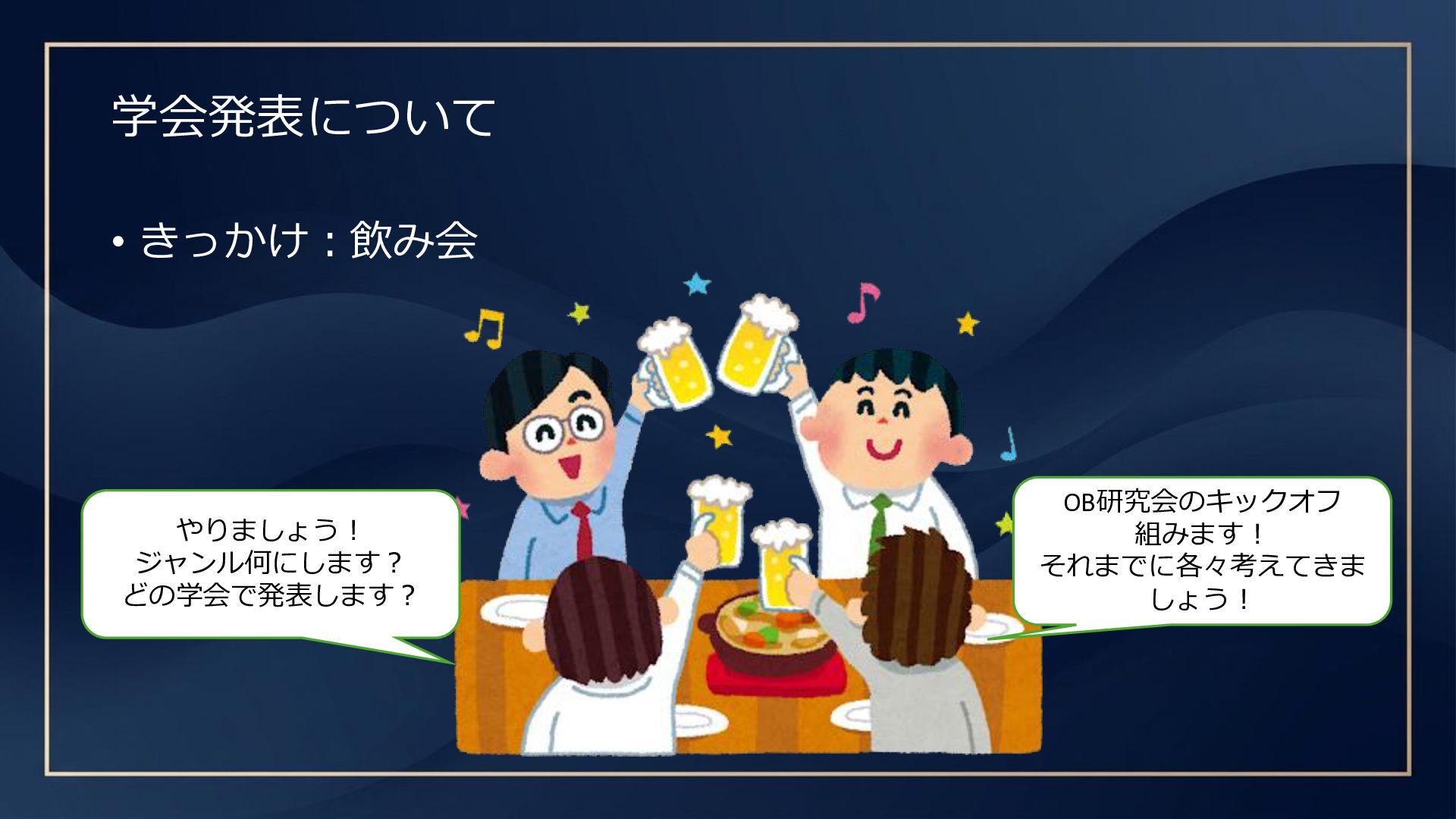 学会発表について • きっかけ:飲み会 OB研究会のキックオフ 組みます! それまでに各々考えてきま しょう! やりましょう! ジャンル何にします? どの学会で発表します?
