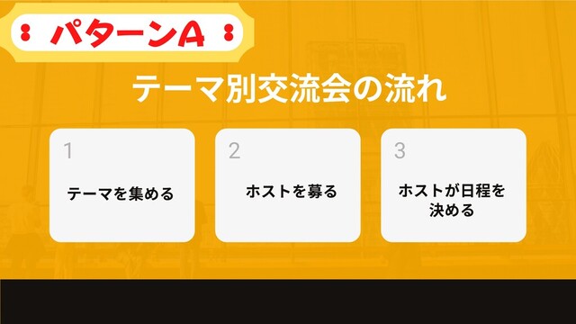 テーマ別 流 の流れ テーマを める 1 ホストを募る 2 ホストが⽇ を