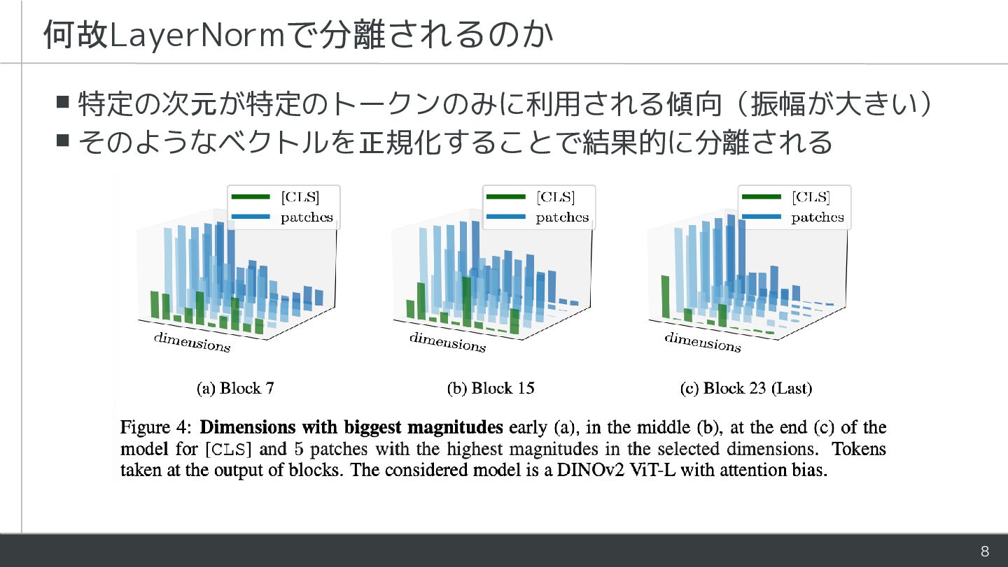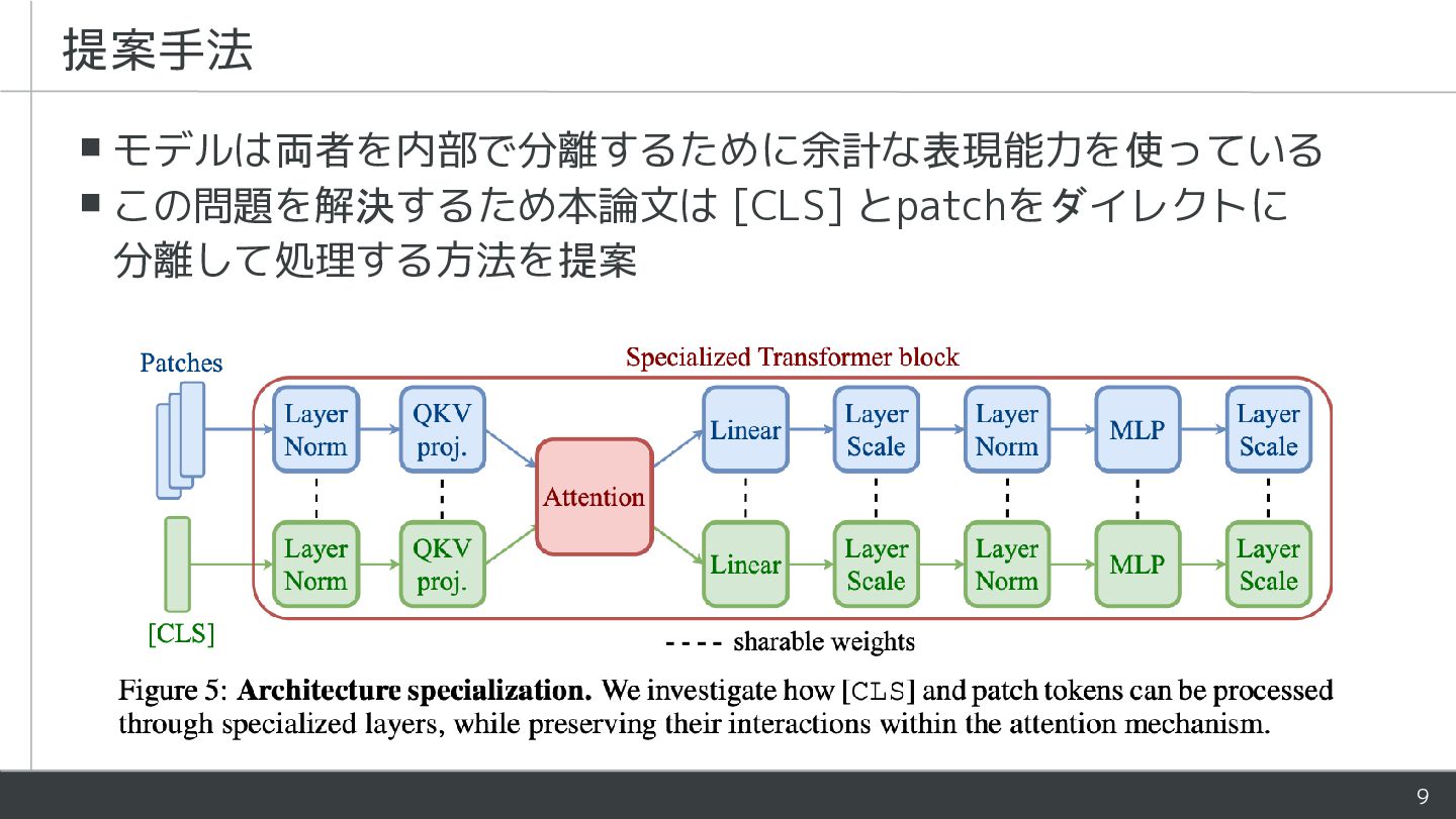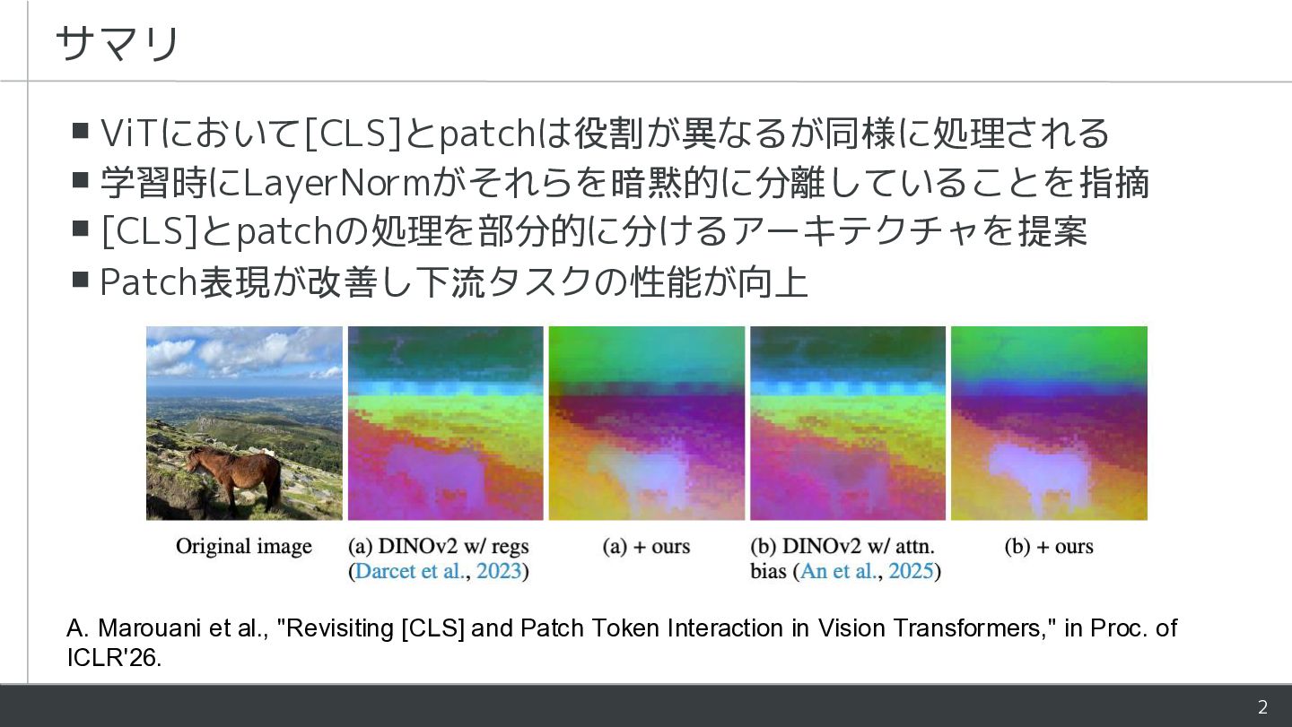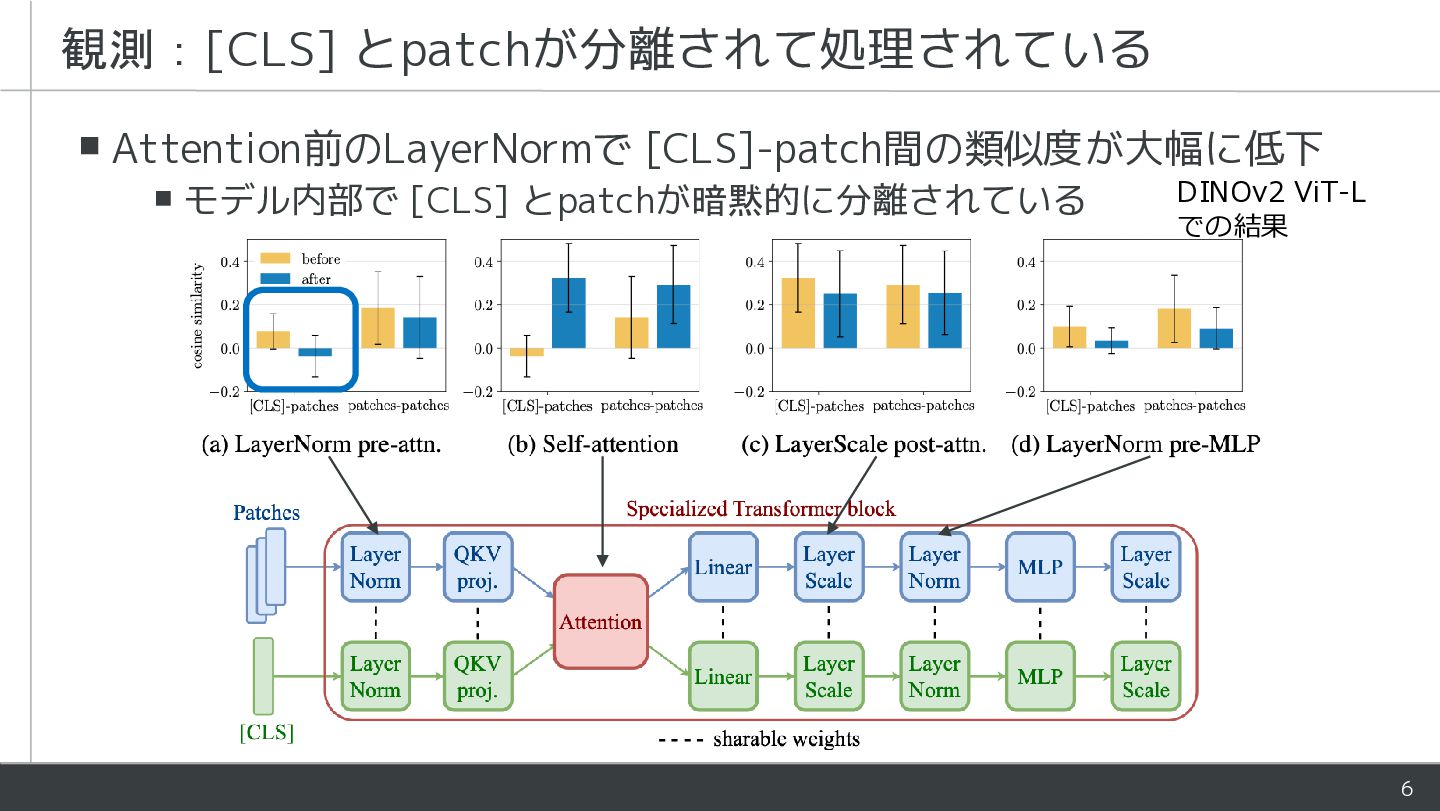 - ViTにおいて[CLS]とpatchは役割が異なるが同様に処理される - 学習時にLayerNormがそれらを暗黙的に分離していることを指摘 - [CLS]とpatchの処理を部分的に分けるアーキテクチャを提案 - Patch表現が改善し下流タスクの性能が向上