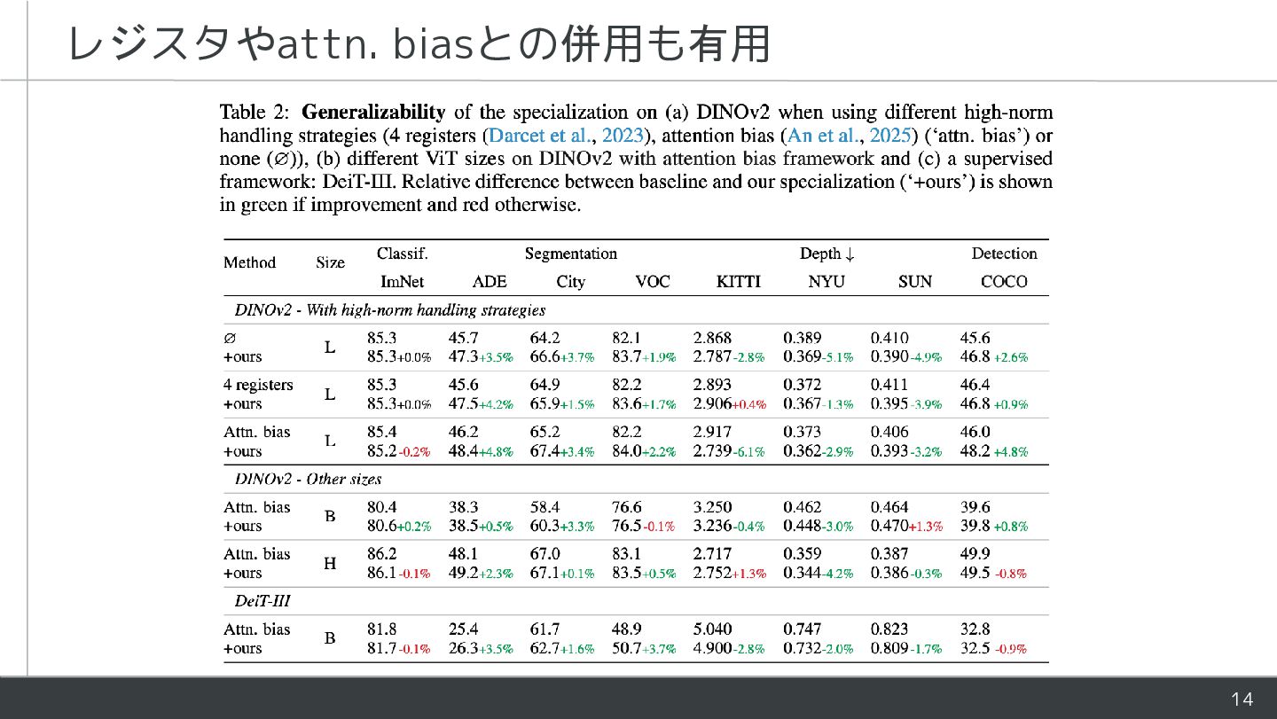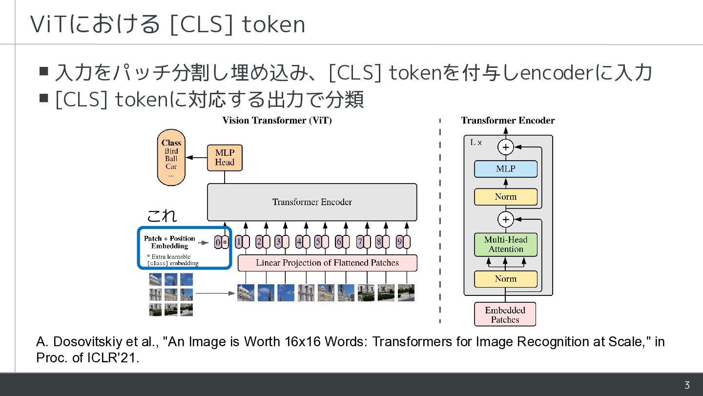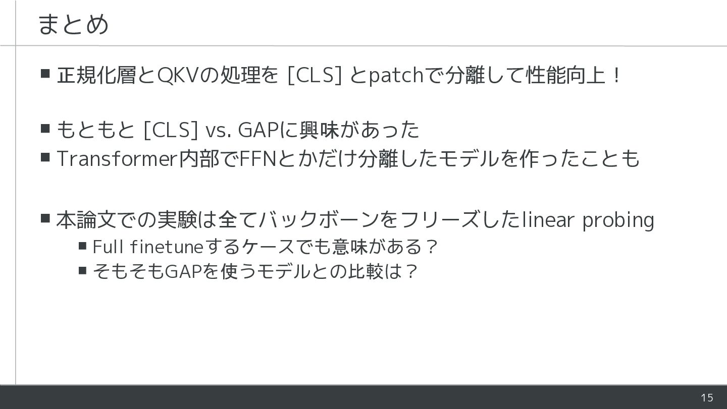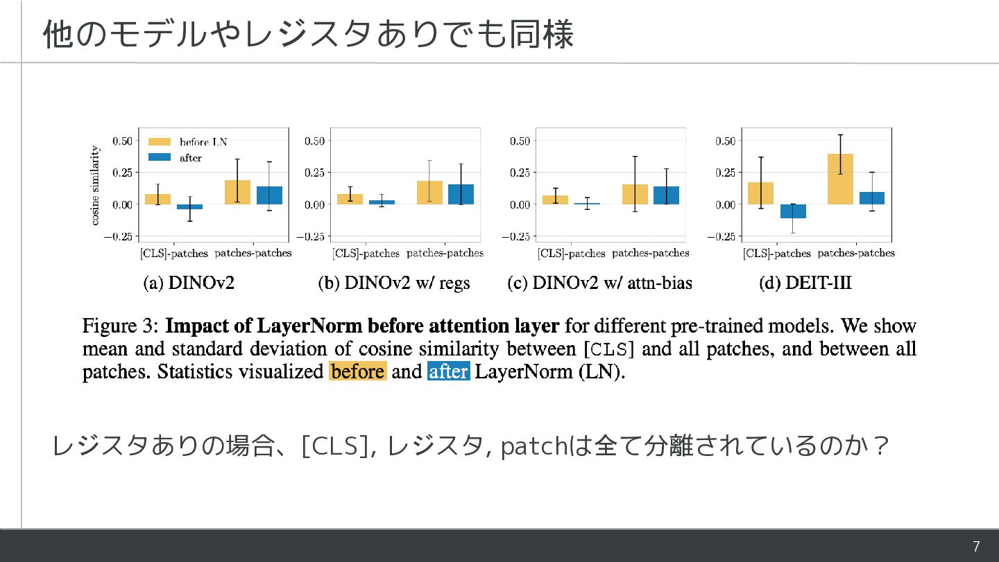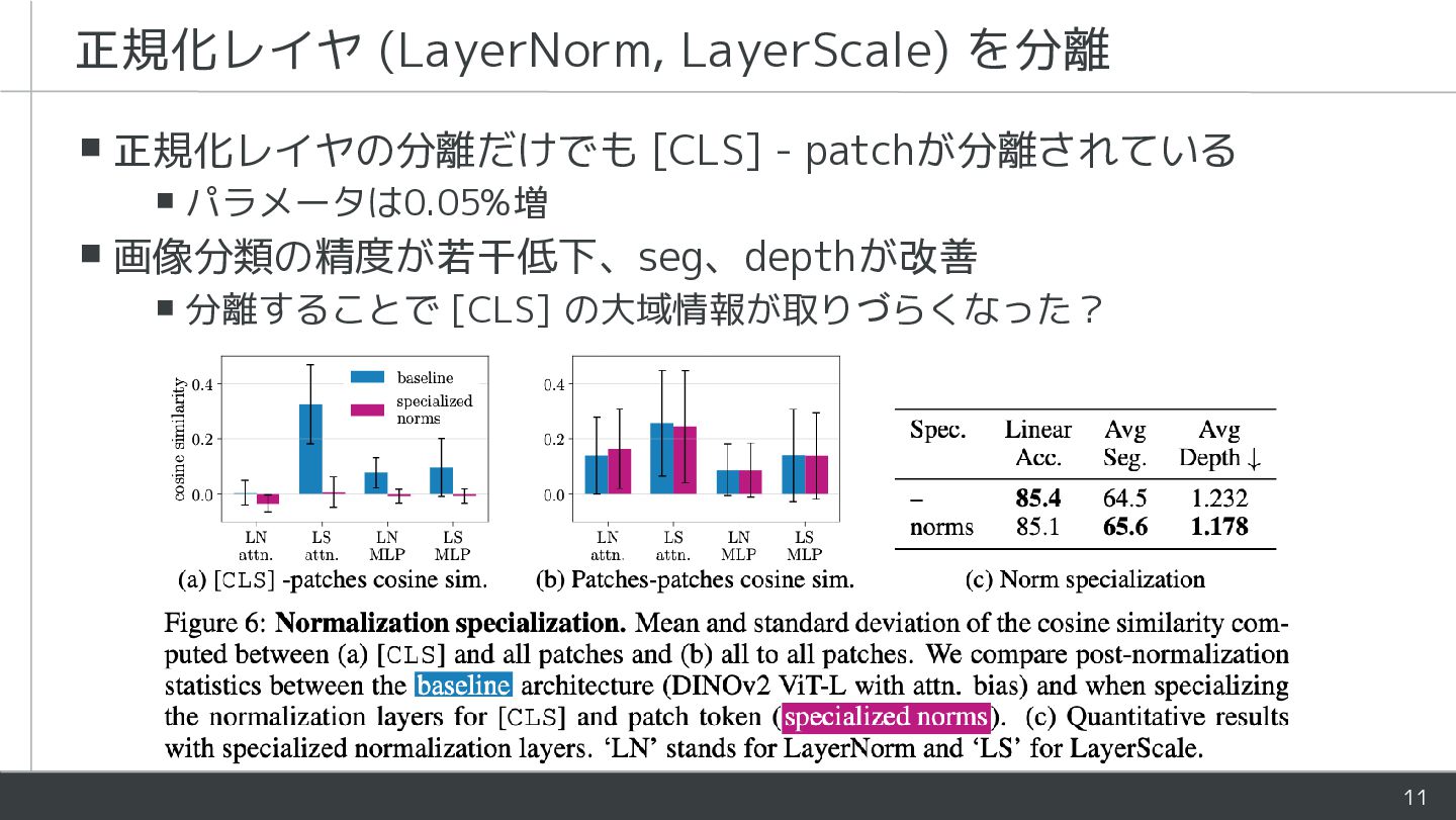 - ViTにおいて[CLS]とpatchは役割が異なるが同様に処理される - 学習時にLayerNormがそれらを暗黙的に分離していることを指摘 - [CLS]とpatchの処理を部分的に分けるアーキテクチャを提案 - Patch表現が改善し下流タスクの性能が向上