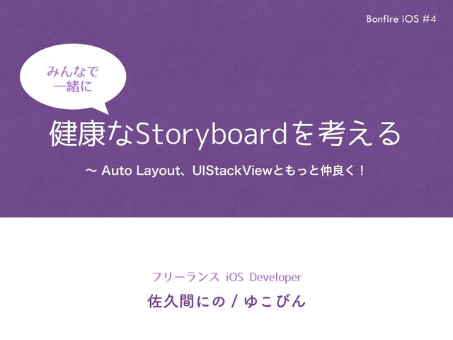 ࠤٱؒʹͷΏ͜ͼΜ Bonfire iOS #4 ϑϦʔϥϯεJ04%FWFMPQFS 健康なStoryboardを考える ΈΜͳͰ Ұॹʹ ʙ"VUP-BZPVUɺ6*4UBDL7JFXͱͬͱྑ͘ʂ
