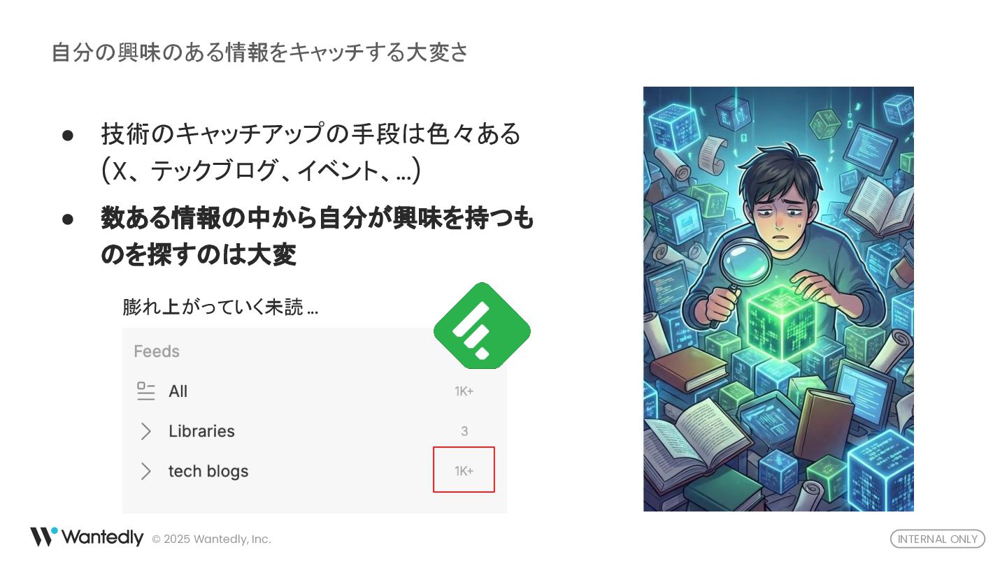 © 2025 Wantedly, Inc. INTERNAL ONLY 自分の興味のある情報をキャッチする大変さ • 技術のキャッチアップの手段は色々ある (X、