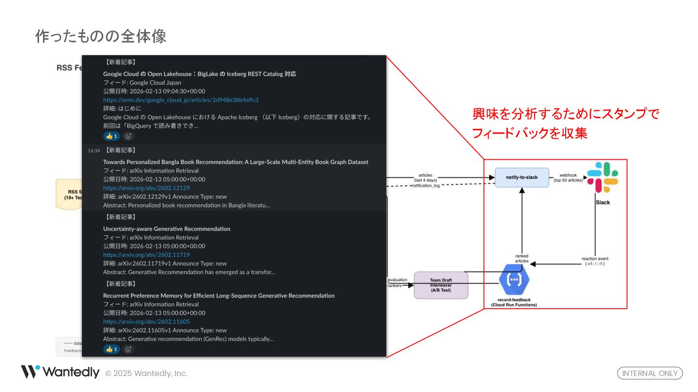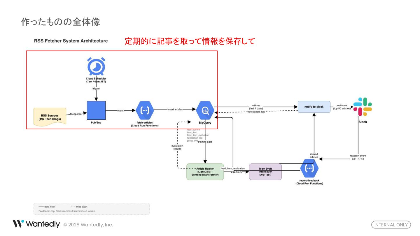 © 2025 Wantedly, Inc. INTERNAL ONLY 作ったものの全体像 定期的に記事を取って情報を保存して
