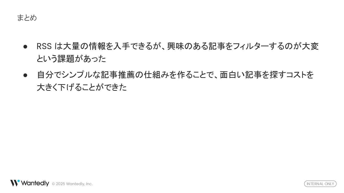 © 2025 Wantedly, Inc. INTERNAL ONLY まとめ • RSS は大量の情報を入手できるが、興味のある記事をフィルターするのが大変