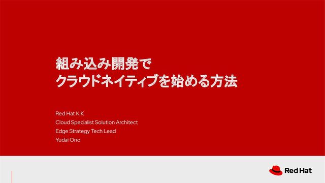 レッドハット株式会社 Cloud Specialist Solution Architect Edge Strategy Tech Lead 小野 佑大 @pinkink_yudai 1987年2月生まれ 埼玉県出身 趣味 バンド / エッジ自宅ラボ作り OpenShiftのプリセールス Edge Computingを担当 出版 Knative実践ガイド - インプレス 2