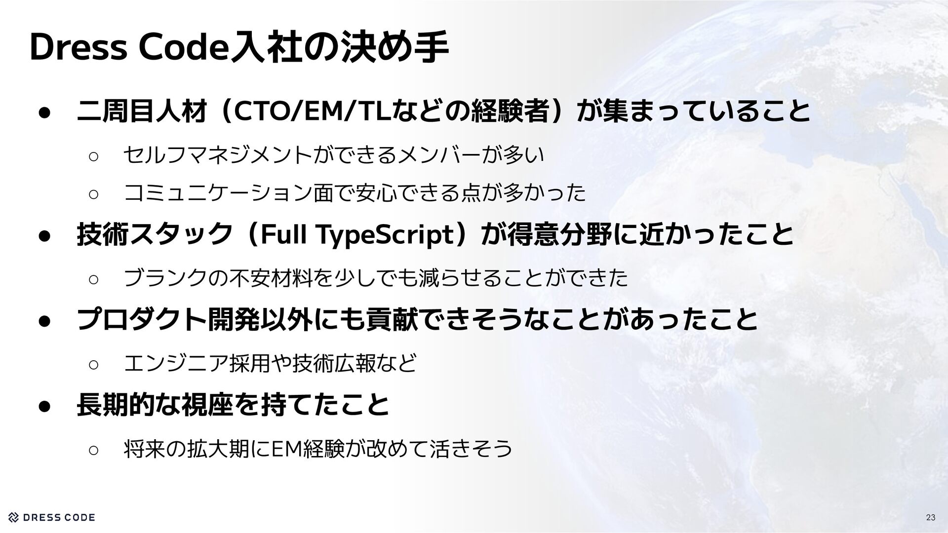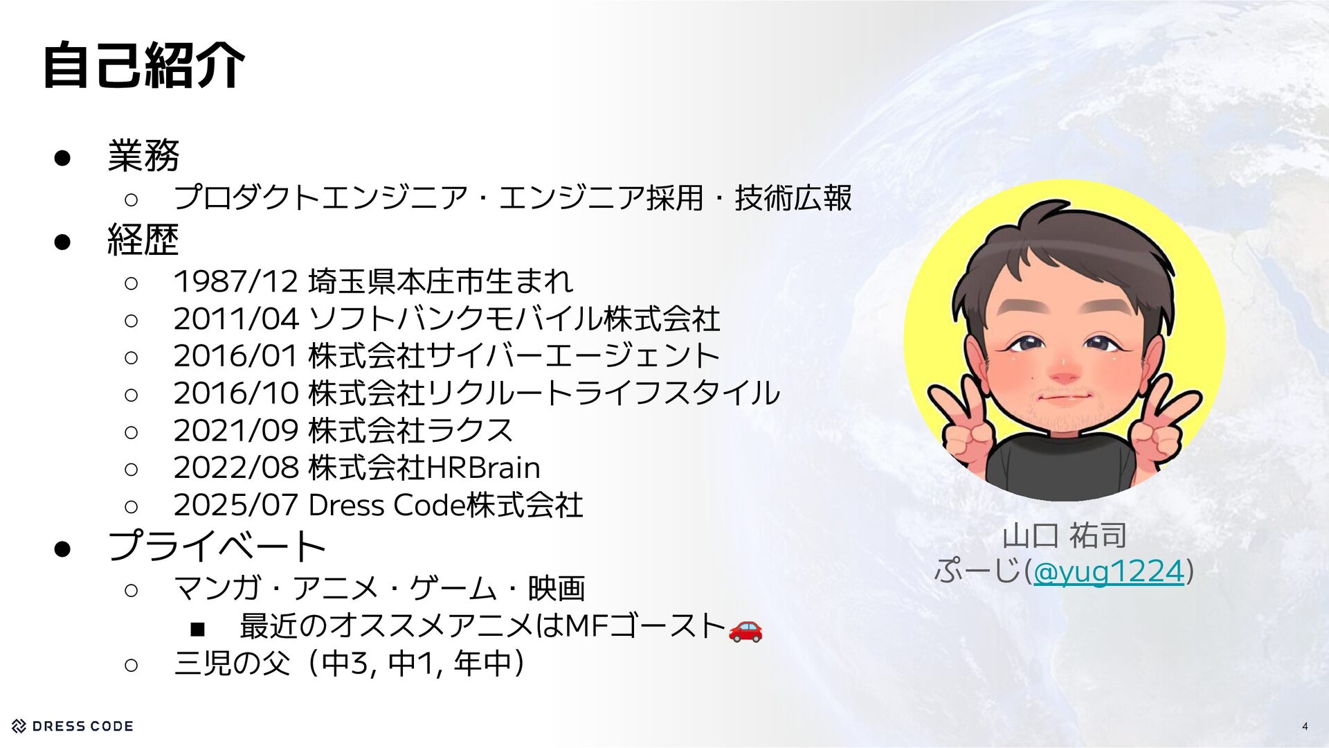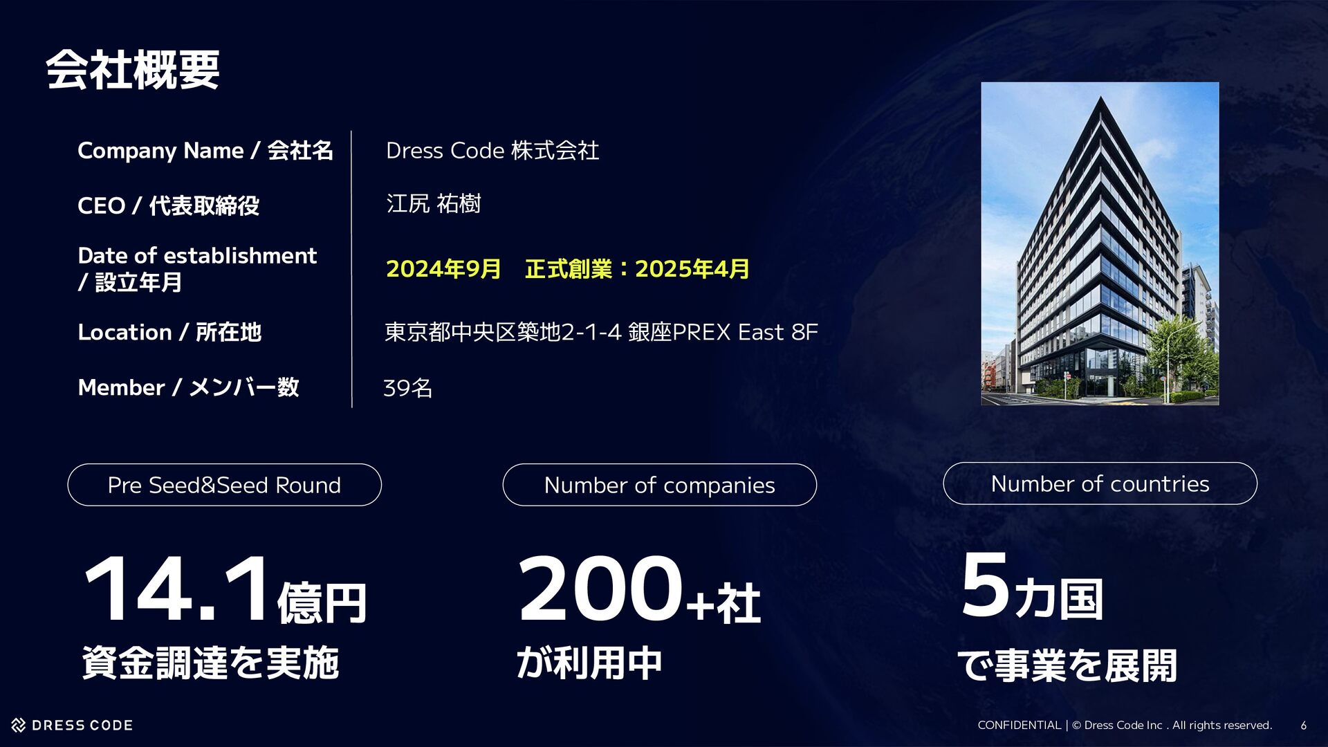 14.1億円 資金調達を実施 Pre Seed&Seed Round 200+社 が利用中 Number of companies Number of countries 5カ国 で事業を展開 会社概要 Company Name / 会社名 Dress Code 株式会社 2024年9月 正式創業:2025年4月 39名 東京都中央区築地2-1-4 銀座PREX East 8F CEO / 代表取締役 Date of establishment / 設立年月 Location / 所在地 江尻 祐樹 Member / メンバー数 6
