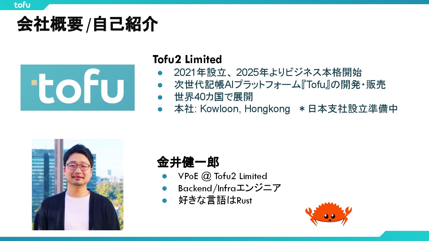 好きな言語はRust Tofu2 Limited • 2021年設立、 2025年よりビジネス本格開始 • 次世代記帳AIプラットフォーム『Tofu』の開発・販売 • 世界40カ国で展開 • 本社: Kowloon, Hongkong *日本支社設立準備中